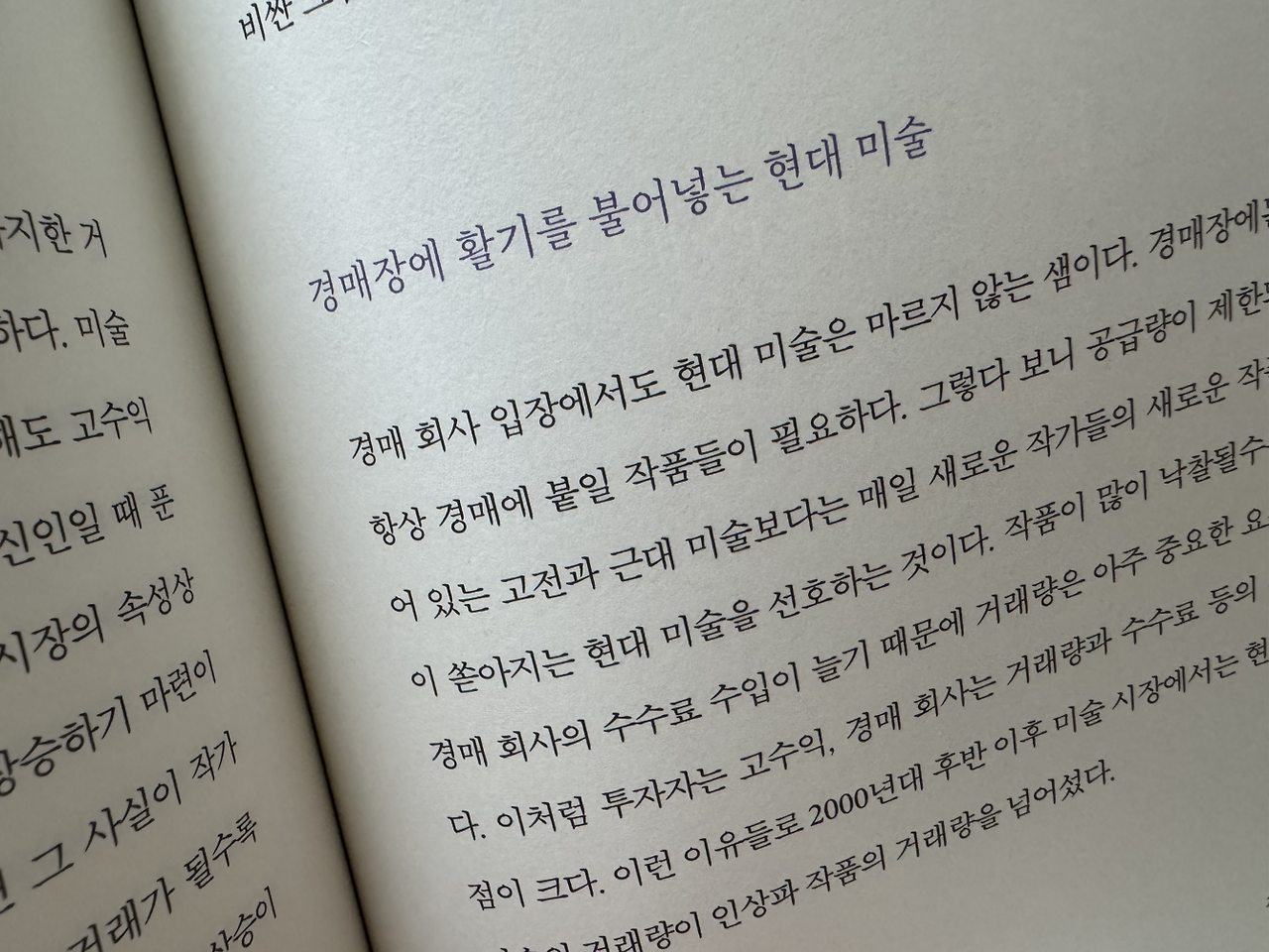 개인적으로는 미술품을 단순한 감상의 대상이 아닌 투자 상품으로 보게 된 계기가 있었는데, 바로 몇 년 전현대 작가의 작품을 조각으로 투자하게 된 경험 덕분이었다. 주식처럼 작품의 일부를 소유하는 그 과정은 미술 시장에 대한 호기심을 자극했고, 이 책은 그러한 궁금증을 해소하는 데 큰 도움이 되었다.