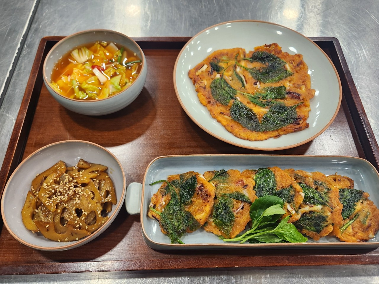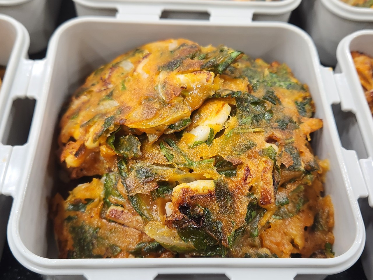오늘 노노에서는 도시락 봉사 일이다. 우리 조는 고추장떡을 부친다. 한명숙 선생님과 처음 장떡을 배울 때는 고추장과 된장을 풀어 넣는 부침개에 반신반의했다. 하지만 반전. 아무런 별다른 간을 하지 않아도 깊은 맛이 저절로이다. 다만 오징어를 잘게 썰어 넣은 것과 양파를 얇게 썰어 넣은 것이 그 역할을 다할 뿐이다. 장식으로 취나물의 어린잎을 화전처럼 정성껏 표면에 얹을 뿐이다.