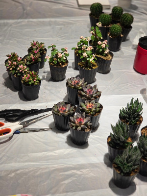 동기들과 화분작업에서 탁자에 비닐로 작업장을 꾸미고 빈 화분과 모종을 옮기고 흙과 자갈을 챙기면서 협력과 우의를 다지고 크게 웃고 조언하며 심은 화분이 완성되었다.
