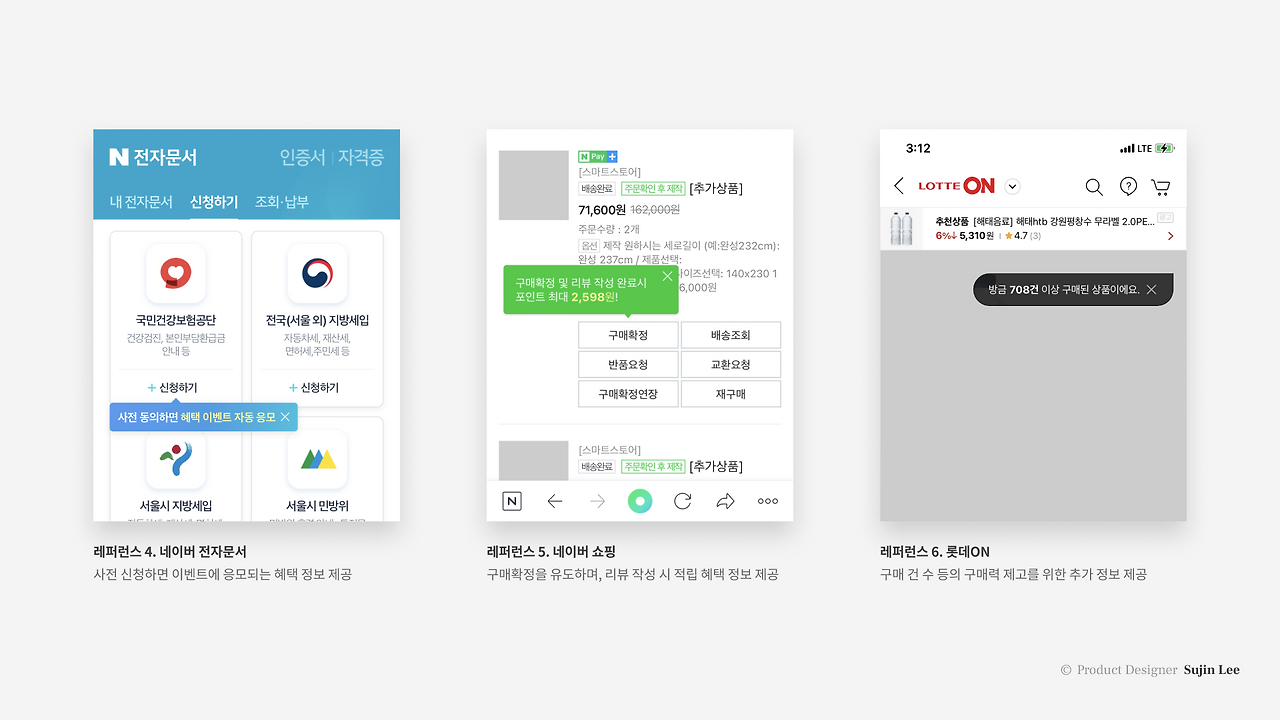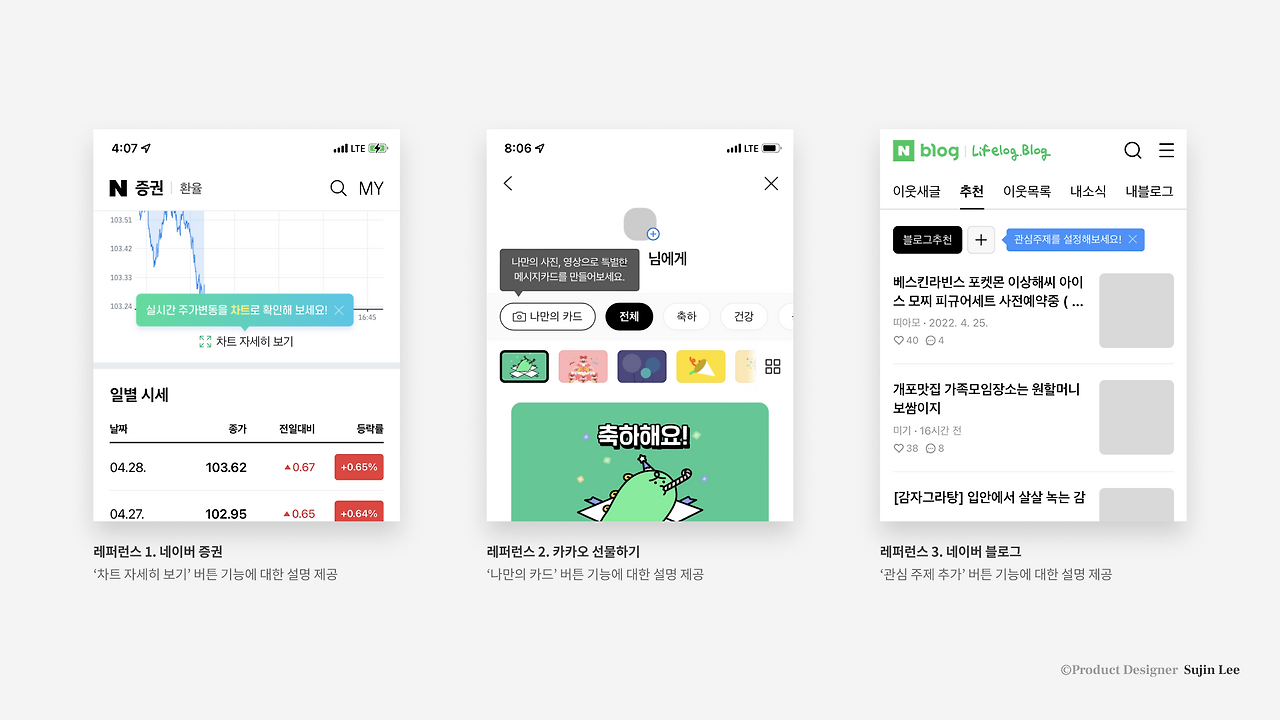 혜택 정보를 제공하는 Tooltip은 기능을 인지하는데 어려움은 없지만, 기능을 이용하면 혜택을 받을 수 있다고 알려주고자 할 때 활용한다. 적절한 맥락에 잘 활용한다면 더할 나위 없이 좋은 마케팅 요소가 될 수 있다. 하지만 Tooltip이 다른 콘텐츠를 가리며 띄우는 컴포넌트이기 때문에 고객에게 불필요한 정보가 될 경우 매우 불쾌한 경험을 전달할 수 있다. 그래서 이러한 Tooltip을 설계할 때에는 UX 라이팅 전략이 매우 중요하다. 아래에 찾아본 레퍼런스는 UX 라이팅 전략이 잘 적용된 예시라 생각한다. Tooltip의 내용이 군더더기 없이 간결하며, 전환율을 높이는 적절한 맥락에 잘 활용되었다고 생각하기 때문이다.
