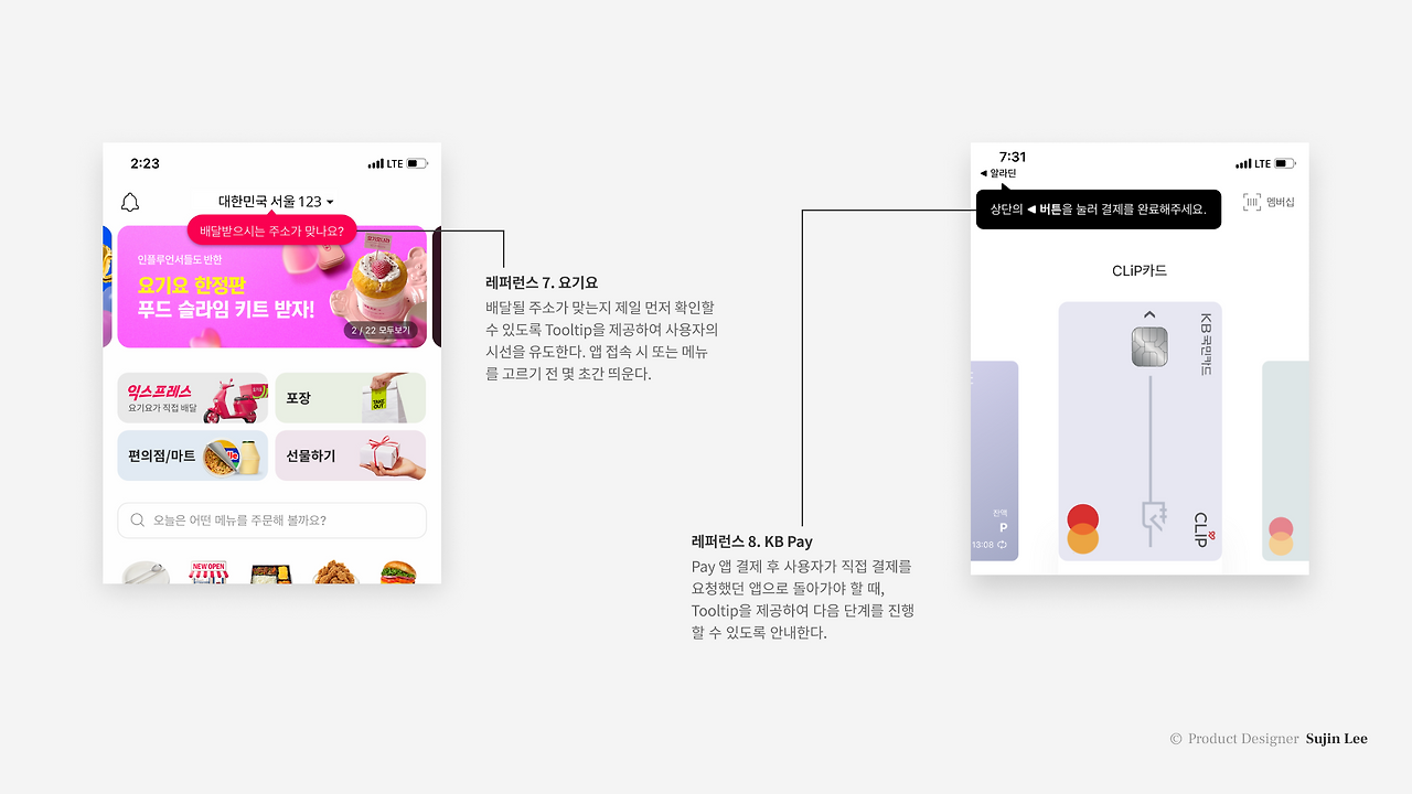 Tooltip 컴포넌트는 정보를 제공하는 기능 이외에 사용자에게 다음에 해야 할 행동을 제시할 때에도 활용된다. 배달의민족이나 요기요 서비스에서 상단의 주소 정보 밑에 '잠깐 이 주소가 맞나요?', '배달 받으시는 주소가 맞나요?'가 나타났다 사라지는 것을 찾아볼 수 있다. 이 Tooltip은 배달 메뉴를 찾기 전 배달될 주소가 맞는지 먼저 확인하도록 행동을 유도하는 기능을 한다. 사용자가 주소를 한 번 더 확인할 수 있는 기회를 제공하며, 잘못된 장소로 배달되는 것을 사전에 방지할 수 있다.