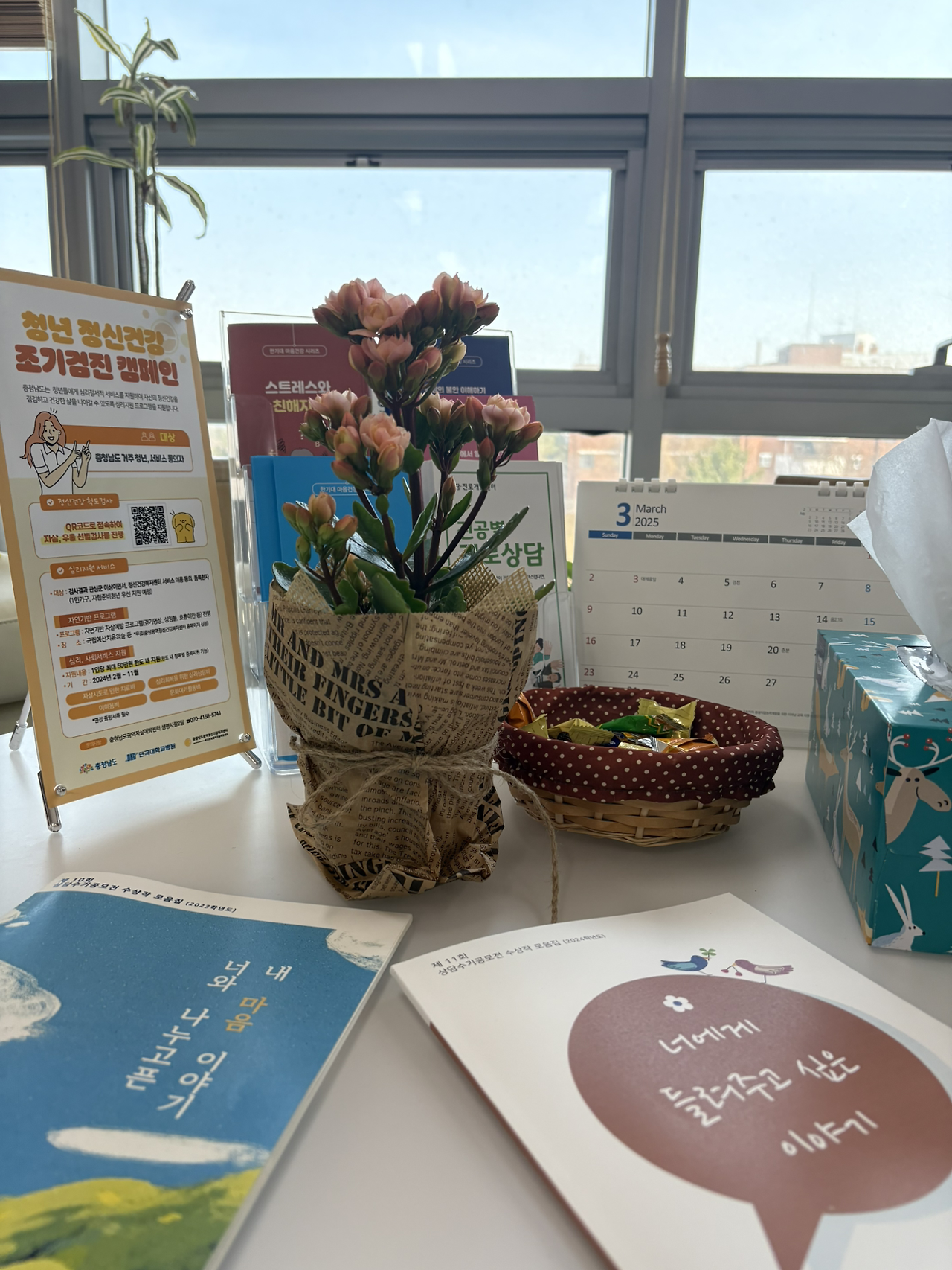 * 꽃을 가져가 센터에 봄기운을 불어넣은 것을 칭찬한다.