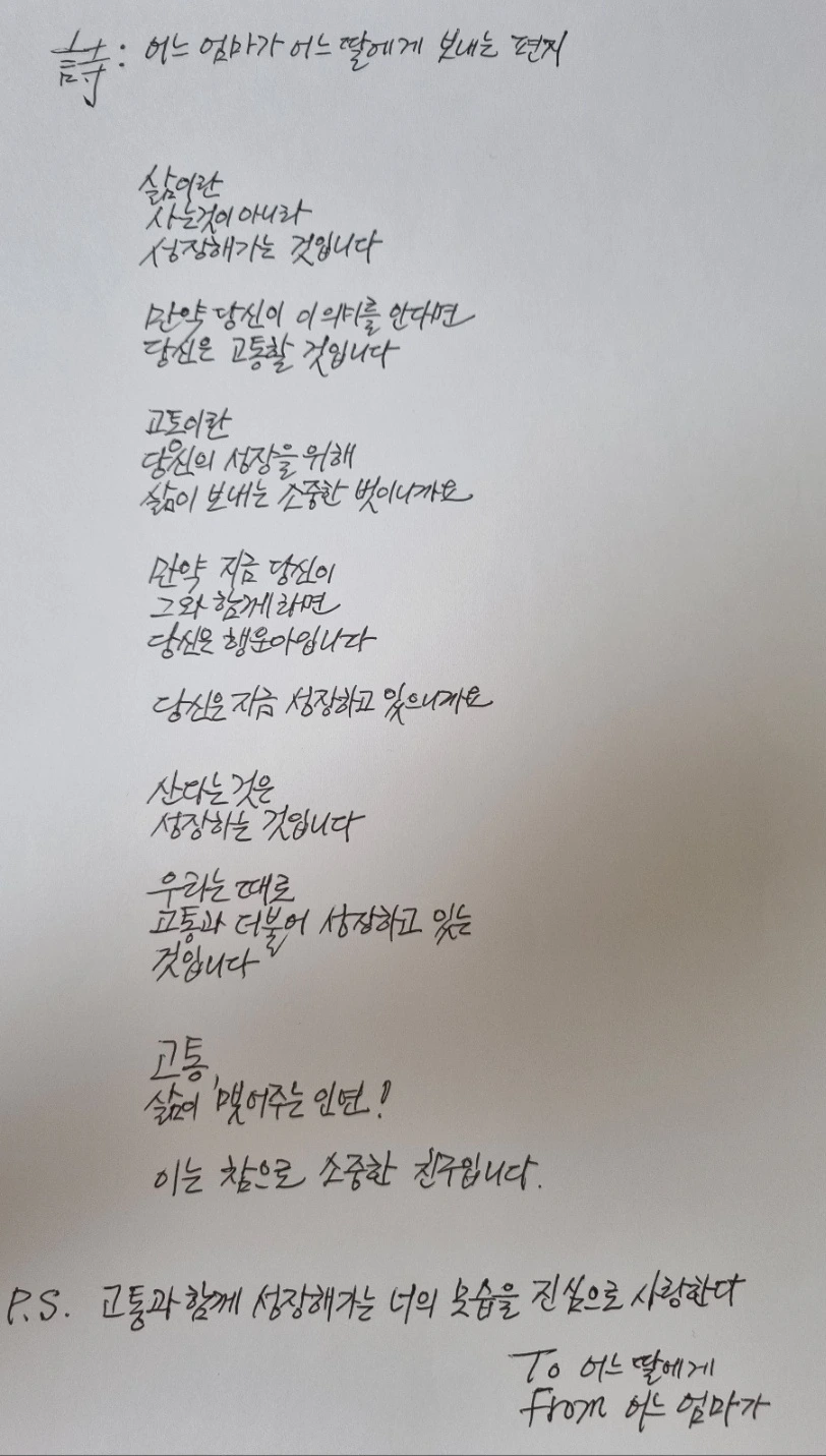 손수 한 글자 한 글자 써주신 그 마음이 제게 와닿는 느낌이 좋아서요.