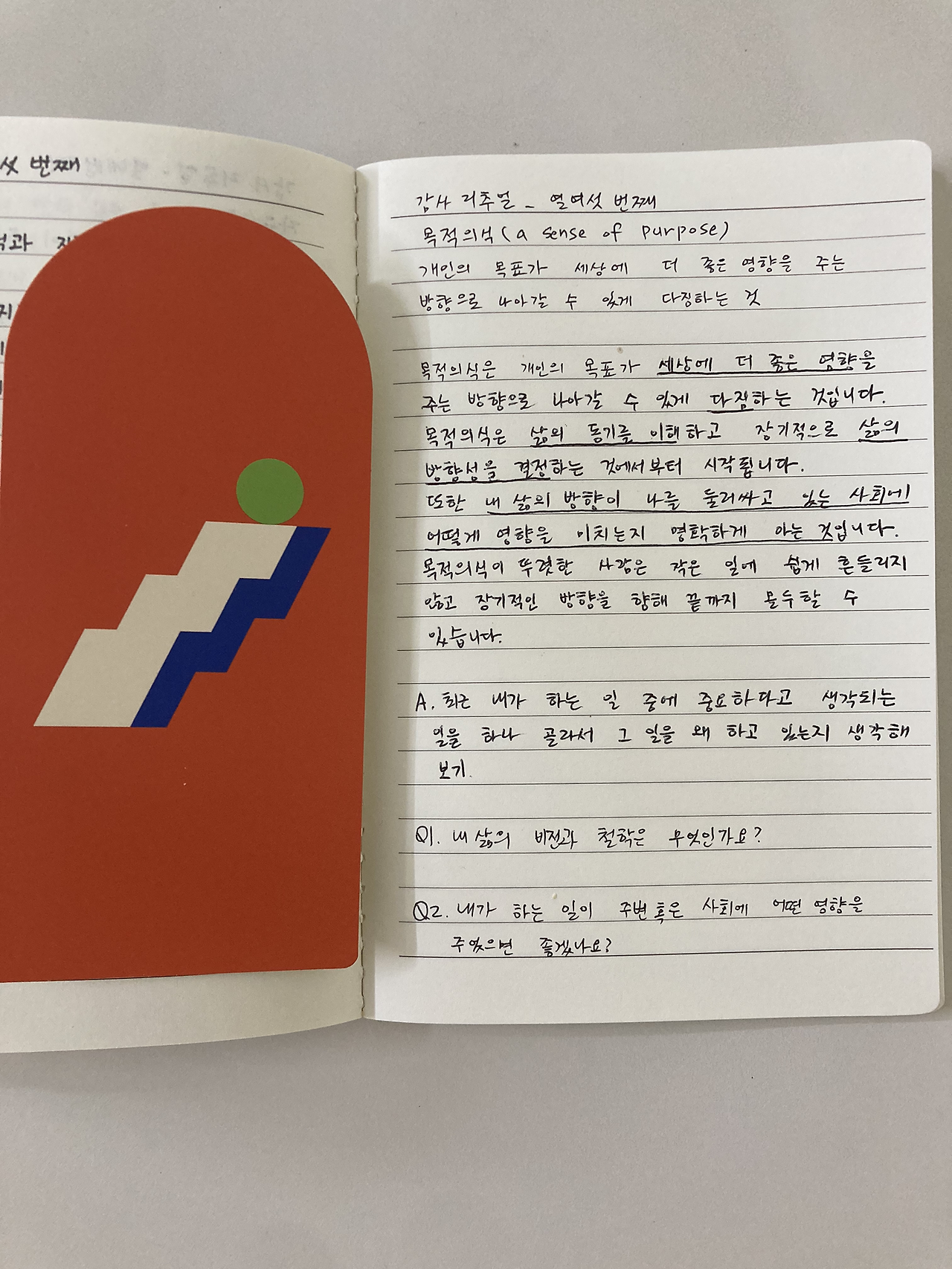 * '목적의식'은 액션과 질문에 답하기가 가장 어려워서 고민을 많이 했다. 그런 걸 보면 나의 목적의식이 뚜렷하지 않다는 반증일 수 있겠다. 완성형의 대답을 하고 싶어서 계속 고민했는데 그러면 리추얼을 못 하게 될 것 같아서 그냥 썼다. 시간이 흐른 뒤에 나의 대답이 어떻게 달라져있을지 궁금하고 기대된다.