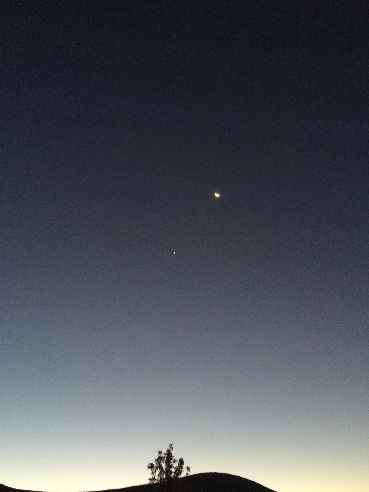 아래쪽 별은 목성, 달 왼쪽은 토성. 그 위는 한없는 우주. 2018년 가을 캘리포니아 황무지에서 핸드폰으로 찍음.