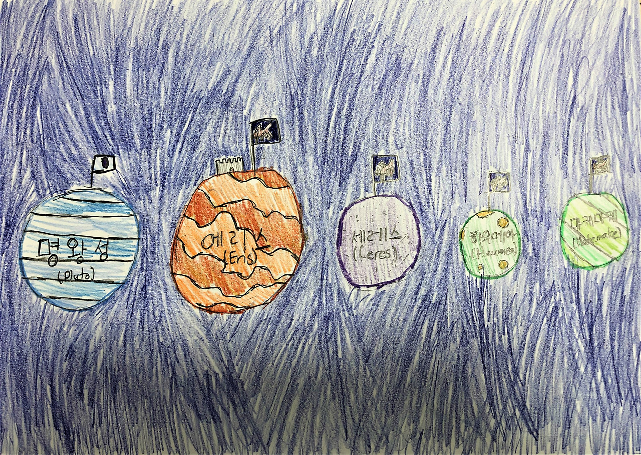 아, 여기에서 소행성과 왜소행성에 대해 구분할 필요가 있다. 소행성(小行星, asteroid)은 그저 바윗덩어리일 뿐이고, 태양 가까이 오면 표면이 벗겨져서 꼬리가 생기는 혜성으로 바뀐다. 소행성들은 주로 화성과 목성 사이에 있는 소행성대와, 해왕성이나 명왕성 너머에 있는 카이퍼 벨트 대에 몰려 있다. 그 반면에 왜행성이라고도 부르는 왜소행성(矮小行星, dwarf planet)은 조금 다른 개념으로서, 소행성보다는 크고 주변의 다른 천체들에게 영향을 줄 수 있는 중력을 가진 것들을 말한다. 왜소행성을 크기대로 나열하면 에리스(Eris), 플루토(Pluto, 명왕성), 하우메아(Haumea), 마케마케(Makemake) 그리고 세레스(Ceres), 이렇게 다섯 개가 있다. 이것을 다시 태양에서 가까운 순서대로 정리하면 명왕성, 에리스, 세레스, 하우메아, 마케마케가 된다. 이들 왜소행성은 중력이 제법 강해서 명왕성처럼 주변에 달을 거느리고 있기도 하다.