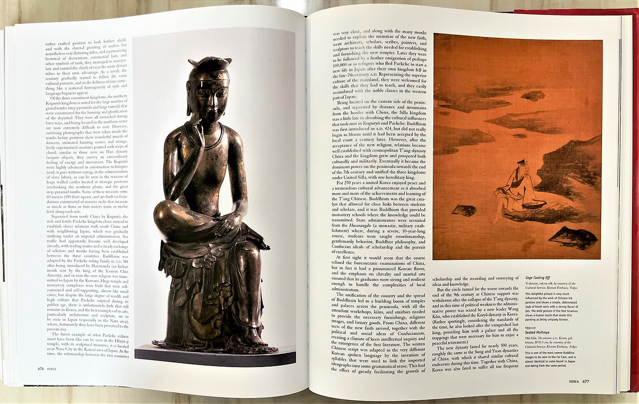 위의 수치는 여기 소개하는 또 한 권의 책 《The Art of East Asia》에 수록된 아시아 국가들의 비중을 표시한 것이다. 가로세로 27.5×31cm, 두께 6.5cm의 아주 우람하고도 두툼한 책. 동아시아의 역사 유물을 소개한 이 책에서 우리나라가 차지하는 비율은 4%에 해당한다. 하긴 ‘동남아시아’처럼 기타 등등의 뭉뚱그린 그룹에 들어가지 않고 ‘Korea’라는 단독 부스(?)가 설치되었으니 그나마 위안을 얻을 수 있겠다. 비록 끄트머리에 배치되긴 했지만.