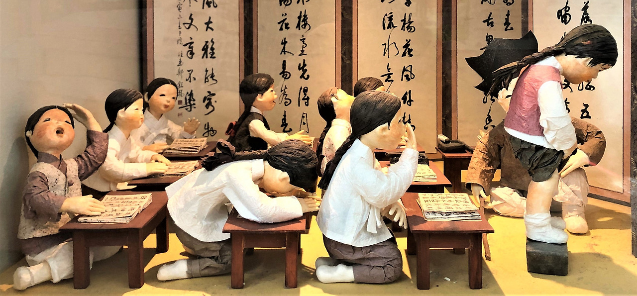 [위의 사진은 외규장각과는 관련이 없으며, 그냥 옛 서당에서처럼 우리도 열심히 공부(?)하자는 의미. 매 맞는 아이는 마치 필자 같은 느낌]