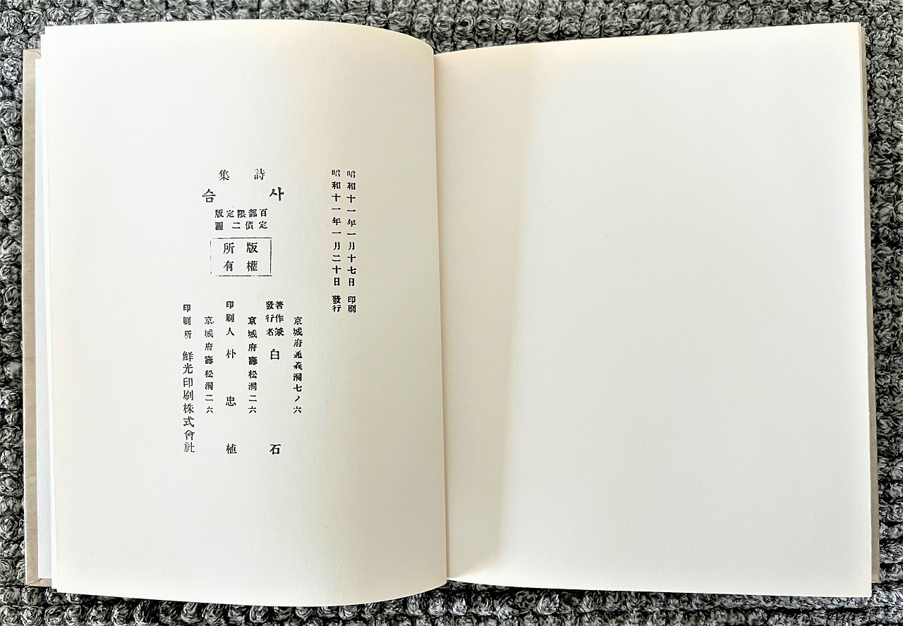 이 시집의 표지에는 흰색 바탕에 ‘白石 詩集 사슴’이라고만 되어 있다. 아무런 그림도 없고, 다른 부연 설명도 없이. 이 시집의 종이는 모두 전통 한지로 되어 있는데, 종이 한쪽 면만 인쇄하여 그것을 접어서 제본했다. 쉽게 설명하면 일반 책이면 4쪽에 해당하는 지면에 2쪽만 인쇄하는 '자루매기 방식'으로 제본되어 있어서 실제로는 144쪽이 되는 것이다. 그러한데도 당시 문인들은 이 시집에 열광했다. 이 책의 100권 중에서 출판기념회에 참석한 손님에게 친필 서명하여 1원씩 받고 20권을 팔았다. 그리고 몇몇 지인들에게 별도로 증정하고, 나머지는 도서관 등에 기증했다고 한다. 그러하니 이 책을 시중에서는 구하려 해도 구할 수 없었던 것이다. 이러한 연유로 위에서 언급했듯이 그 책을 필사하여 가지고 다니는 것을 큰 자랑으로 여겼을 법하다.