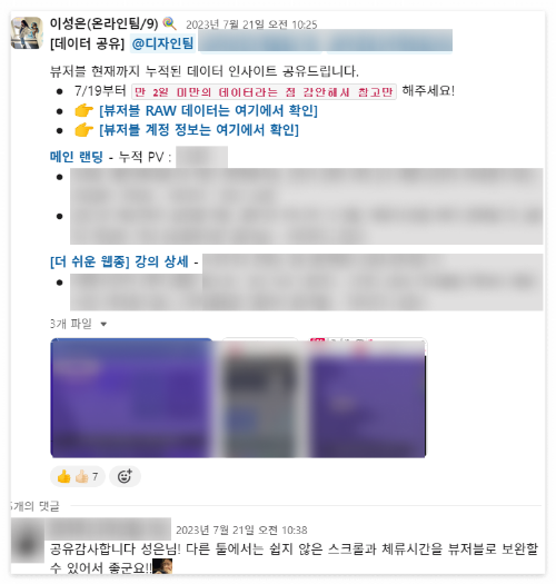 더불어 스쿼드에 제품 데이터를 공유할 때 디자이너가 어떤 것들을 궁금해하는지 파악하려고 종종 가서 여쭙기도 했습니다. 디자이너는 고객의 좋은 경험을 판단할 수 있는 지표를 궁금해할 것이고 이것을 우리가 알고 있는 것이 제품 성장에도 도움이 되기 때문입니다. 파악한 뒤에는 디자이너를 태그해 제품 데이터를 공유했고, 더 나아가 데이터 조회 접근성을 높일 수 있도록 제품 분석 툴의 사용법이나 SQL을 간단히 알려드리기도 했습니다.