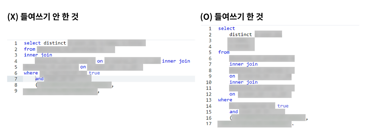 쿼리를 작성한 다음 정합성 피드백 요청을 위해 동료들에게 쿼리를 공유하는 경우도 잦을텐데요. 설명하는 나의 시간을 아끼기 위해, 기꺼이 나를 도와주는 동료의 쿼리 이해 시간을 아끼기 위해- 들여쓰기에 신경쓰는 것을 추천드리고 싶습니다. select, from, where 기준으로만 들여쓰기를 해도 쿼리의 가독성이 훨씬 높아집니다.