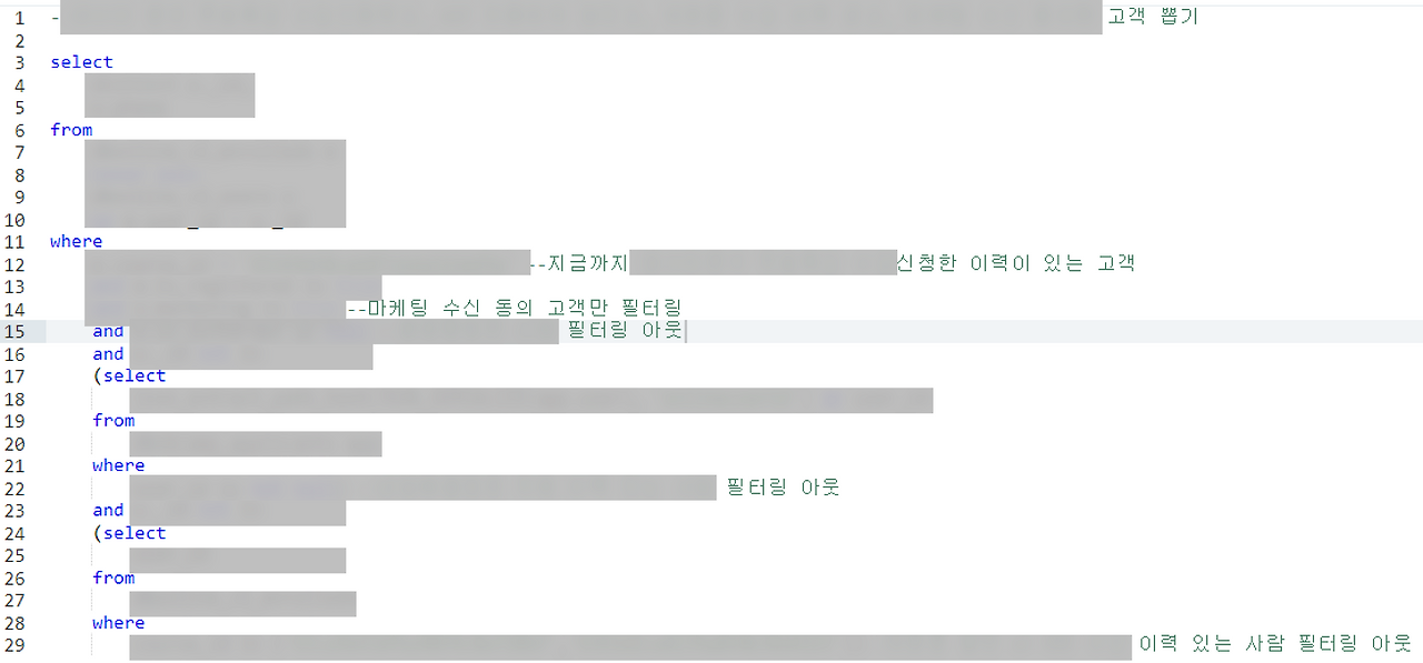 '들여쓰기'가 필요한 맥락과 동일한데요, 쿼리에 오류가 있다면 그건 본인이 직접 쿼리를 실행했을 때 이미 execute가 정상적으로 되지 않았을 것입니다. 그래서 동료들에게 피드백을 요청하는 부분은 '이 쿼리에 함수상 오류는 없는지' 가 아니라 '내가 원하는 데이터를 뽑을 수 있는 쿼리가 맞는지' 즉 의도에 부합한 쿼리인지-와 관련된 부분입니다. 그래서 내 의도를 설명하는 것이 필요합니다. 가급적 row 별로 어떤 의도인지를 작성해두면 단순 피드백 요청 뿐만 아니라 추후에 제 쿼리를 다시 보게 될 때 스스로에게도 큰 도움이 되었습니다. (예를 들어, 쿼리 재활용이 필요할 때요!)