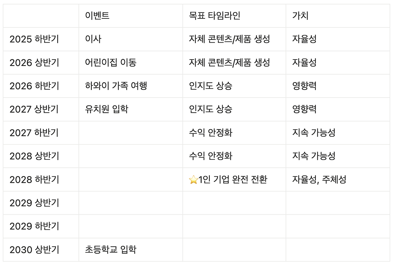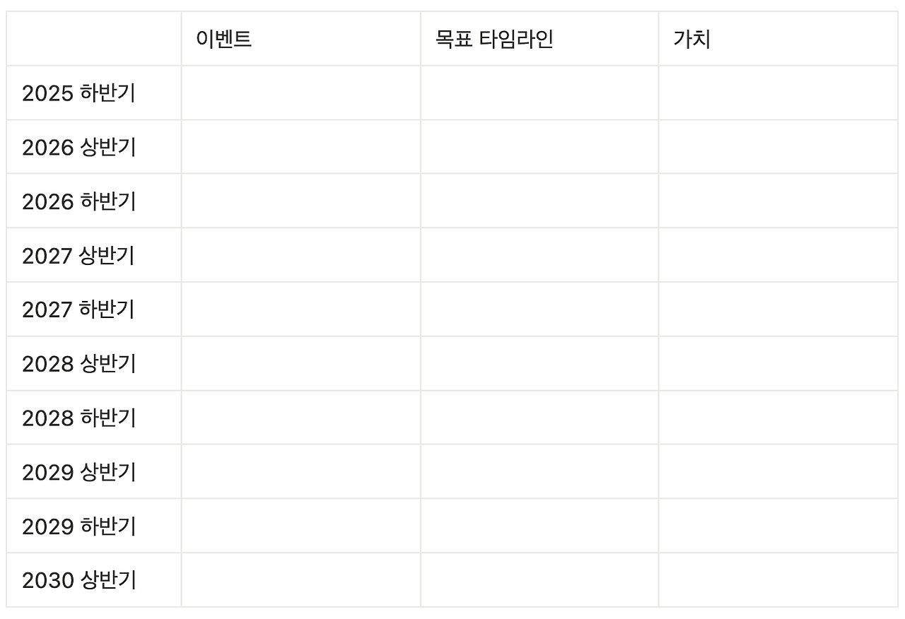 인생의 가치는 고정값이 아니랍니다. 본인이 처한 상황에 따라 생각도, 가치도 유연하게 변하죠. 그래서 저는 앞으로 추구해야 할 인생의 가치를 시기별로 정의하기로 했습니다. 당시 만 1세였던 아이가 초등학교 입학까지 남은 약 기간을 상반기와 하반기로 쪼개어 표를 만들었어요. 표의 열에는 이벤트, 목표 타임라인, 가치를 적었습니다.