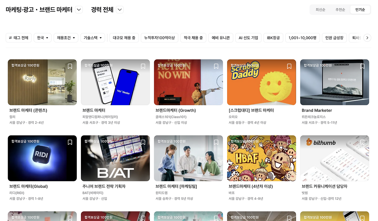 무작정 AI에게 "~~~ 만들어줘"라고 말하는 것은, 신입 사원에게 아무 가이드 없이 "알아서 좀 잘해봐"라고 던지는 것과 같아요. 최소한의 업무 가이드를 만들기 위해 가장 먼저 한 일은 구인구직 사이트를 둘러보는 것이었습니다. 제가 가장 필요했던 직무인 브랜드 마케터의 JD(Job Description)를 살펴보기 위해서였죠.