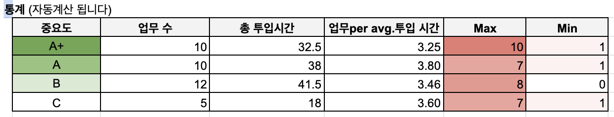 통계 (위 내용들을 작성하면 중요도에 따라 몇 개의 일을 하고 있으며, 한 달에 몇 시간을 소요하고 있는지 자동 계산되도록 수식을 만들었습니다.)