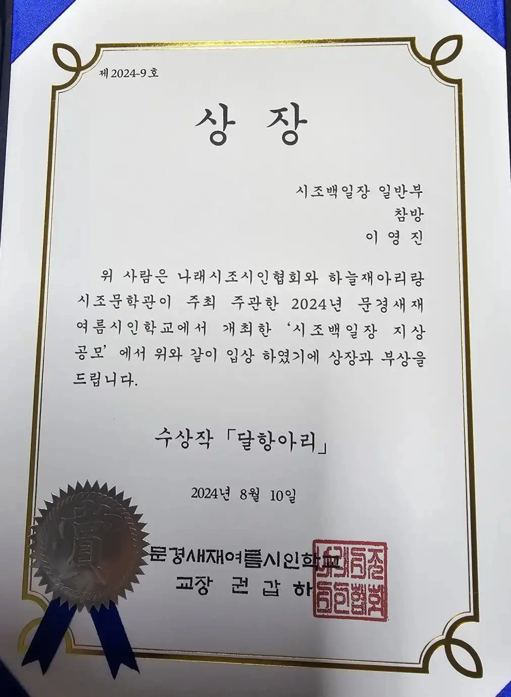 수필춘추 신인상(수필), 종로 문협 신인상(시), 다솔문학상(시), 월간 문학 신인상(민조시), 산문집 <내가 사랑한 소소한 일상들>, 시집 <시와 그림이 만날 때>