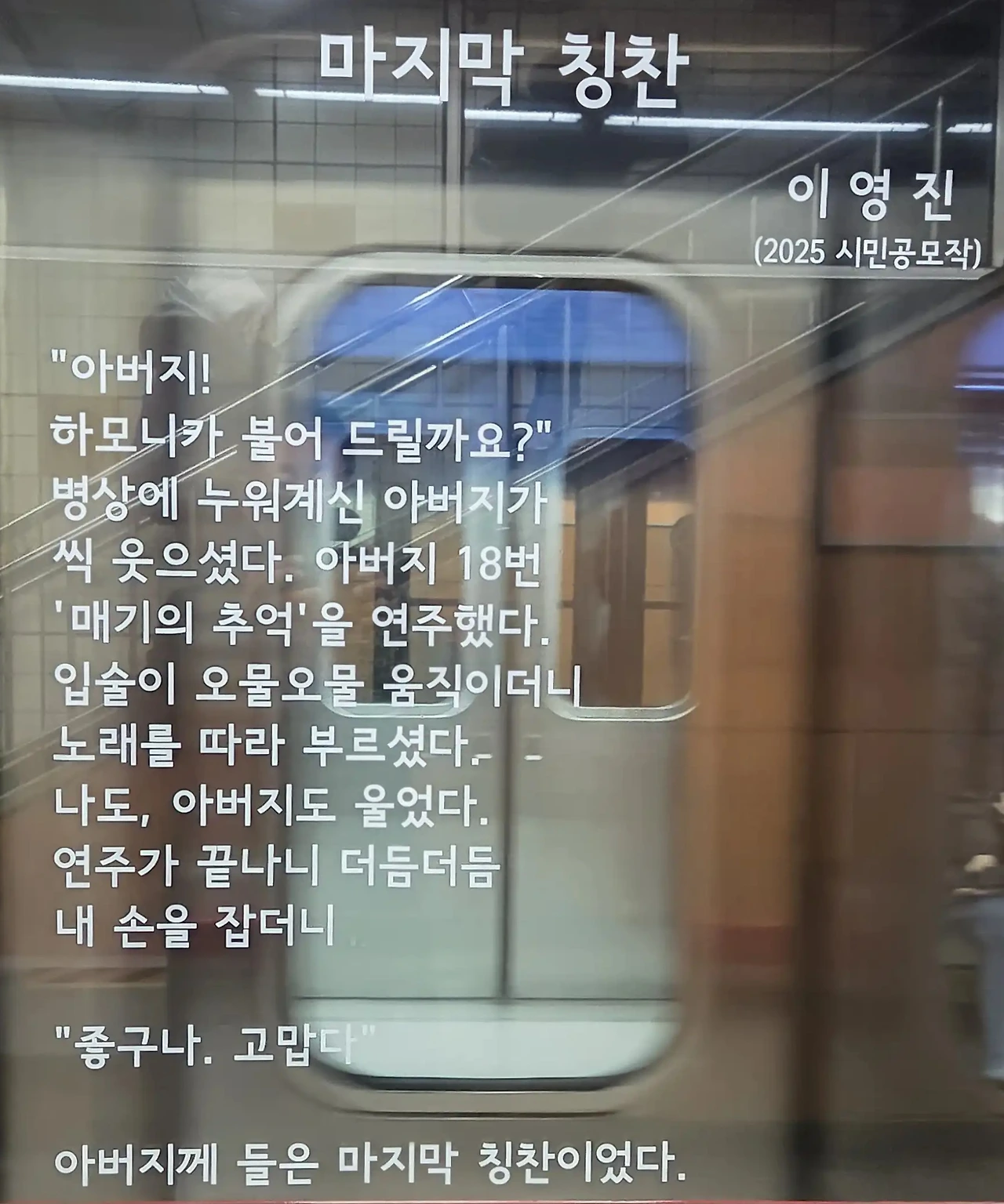 여기를 지나시면 들러 봐 주셔, 제 시가 있대요. 지하철 시인 / 이영진 2025년 서울시 지하철 공모전스크린 도어 작품 게시 현황(이영진)1호선 청량리, 인천 방향 3-3(좌)2호선 서울대입구, 외선 방향 1-3(우)3호선 불광, 대화 방향 8-4(좌)4호선 혜화, 당고개 방향 9-2(좌)6호선 효창공원앞, 봉화산 방면 2-2(좌)