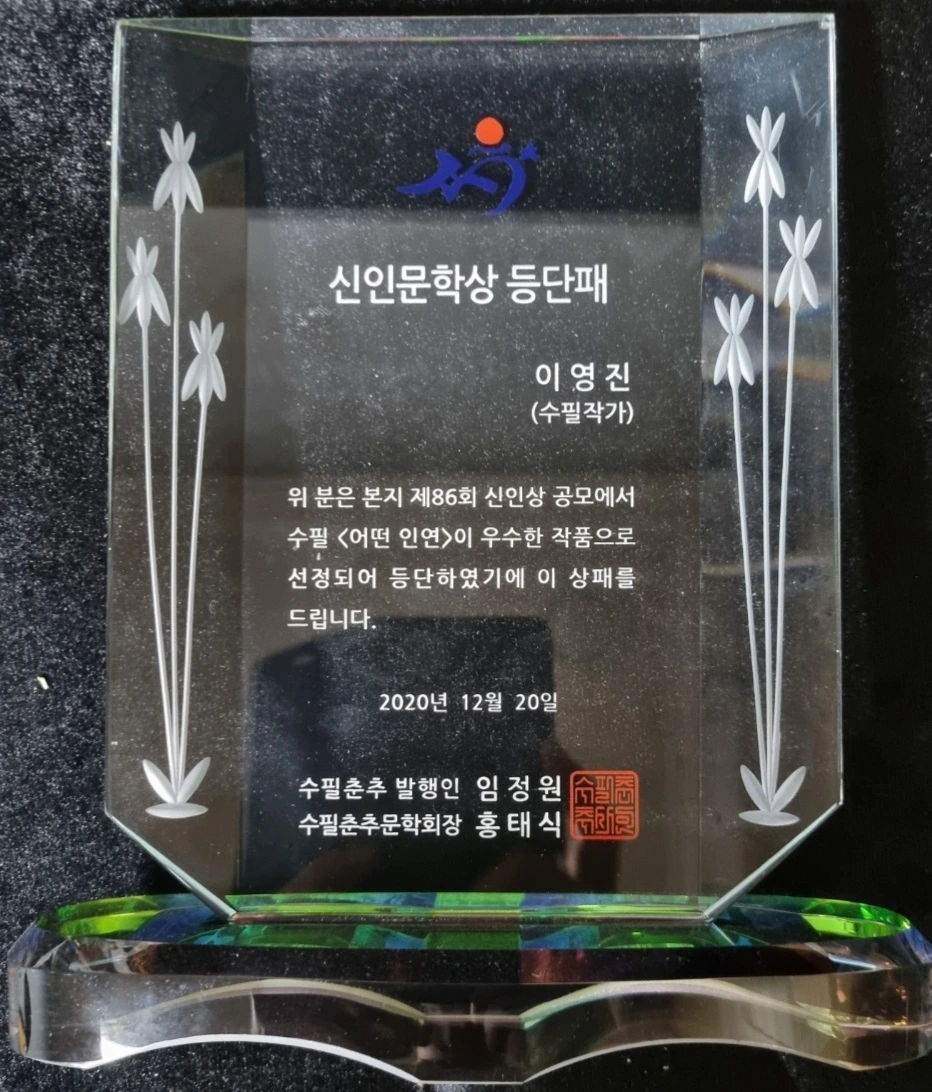 저에게 무허가 이빨꾼 아니냐는 물음이 있어서요. 생애 처음 이렇게 상도 타 봤구요. 한국문인협회 정식 가입헌 문인이예유.