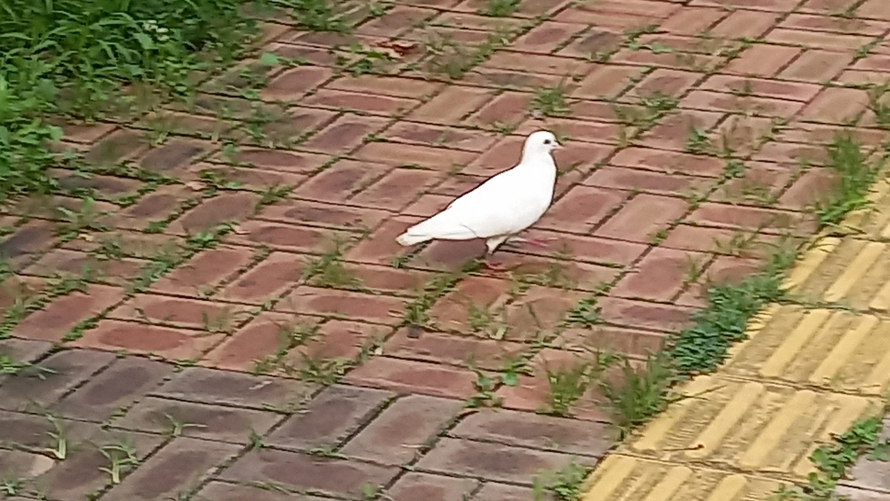 공원 산책길. 흰 비둘기. 행운의 상징.