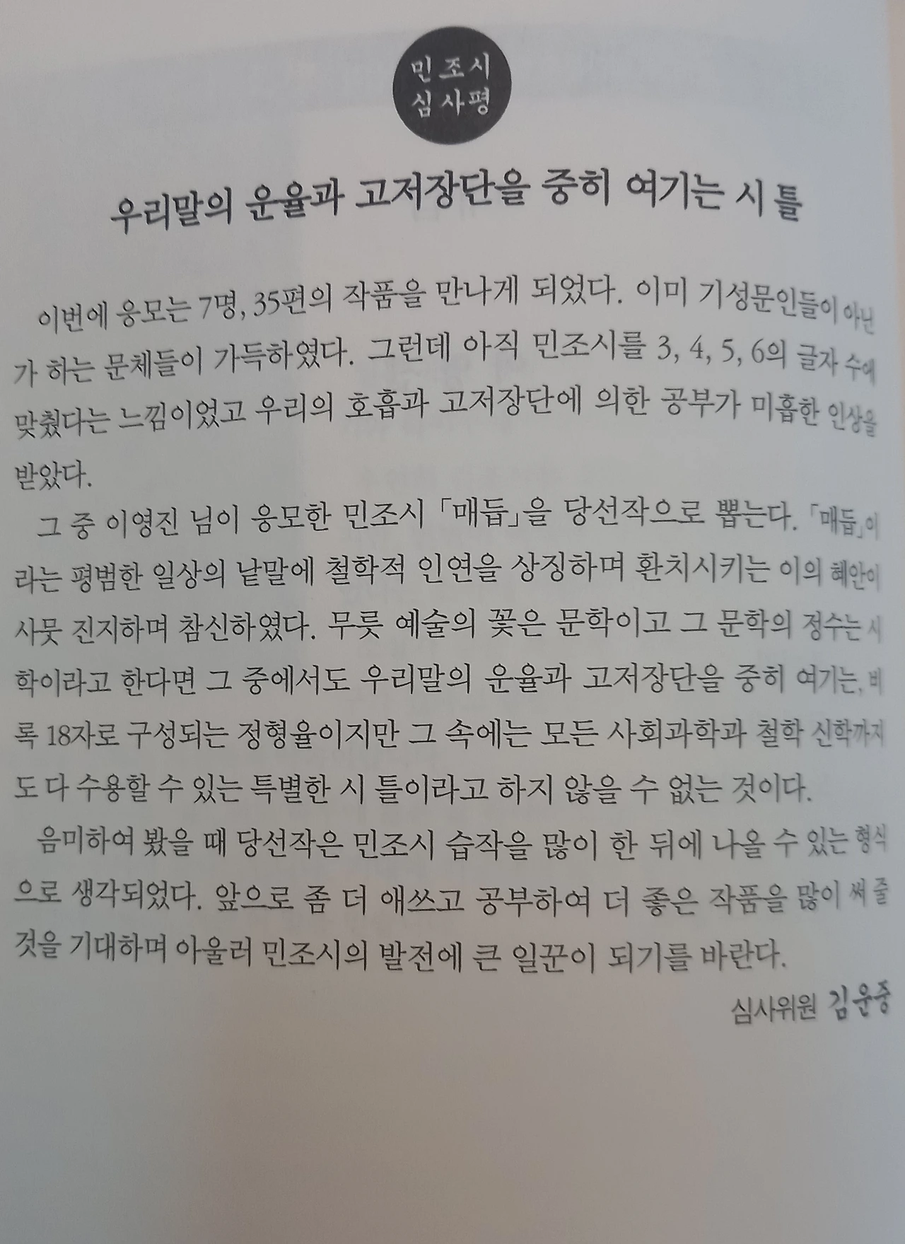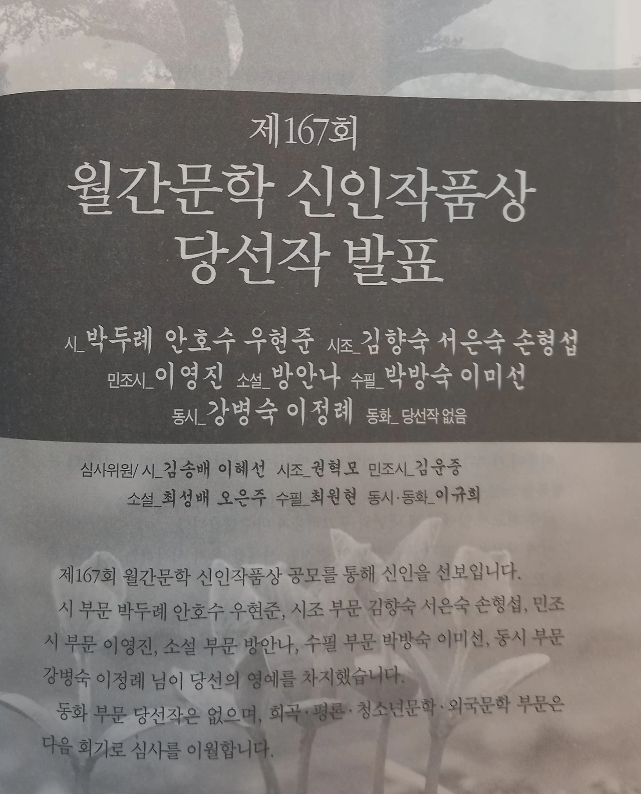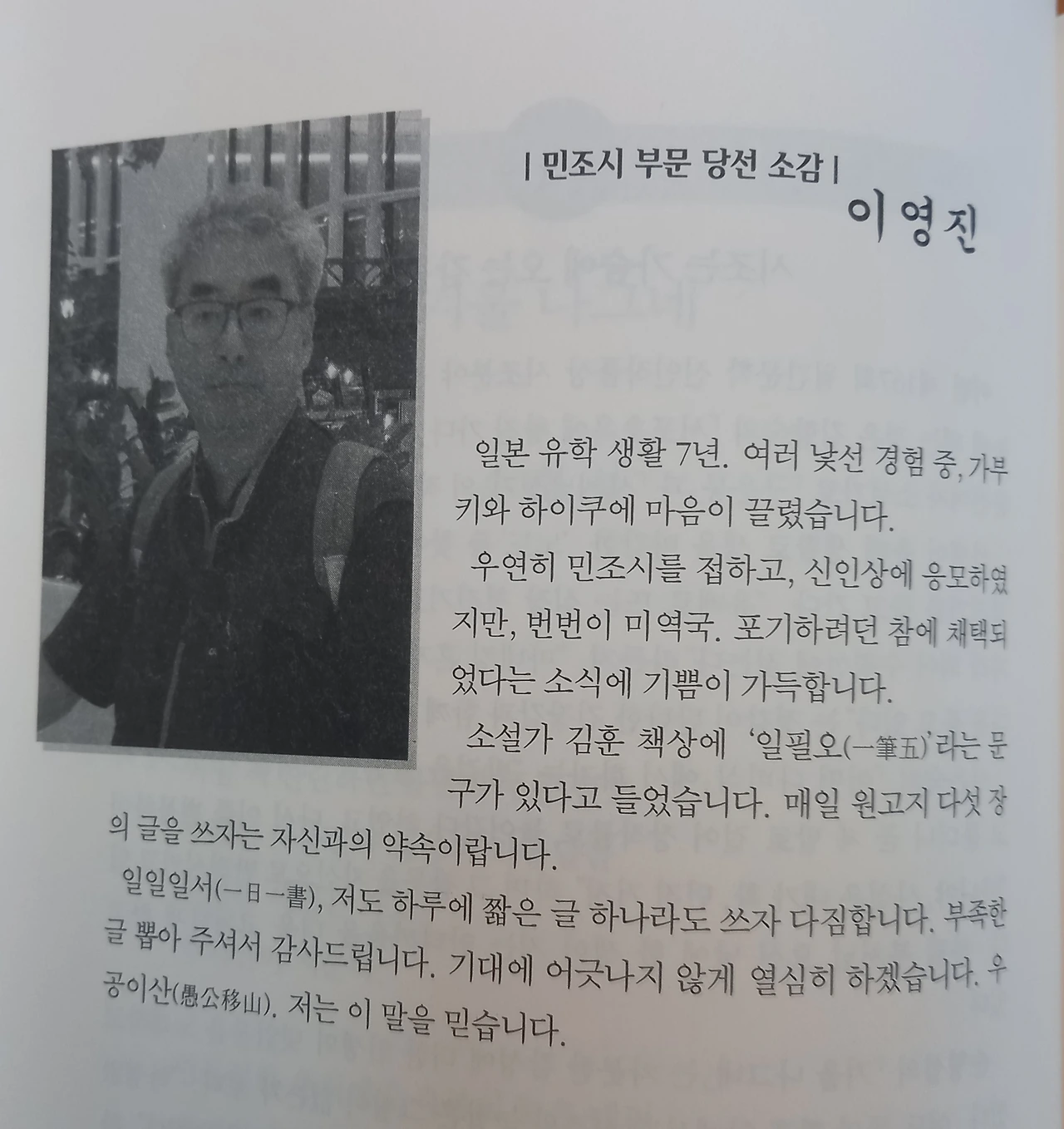 수필춘추 신인상(수필), 종로 문협 신인상(시), 다솔문학상(시), 월간 문학 신인상(민조시), 산문집 <내가 사랑한 소소한 일상들>, 시집 <시와 그림이 만날 때>