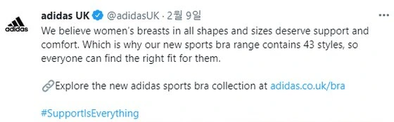 우선 정리를 하자면 Adidas UK 계정에 해당 기사의 내용과 같이 여성의 맨몸이 담긴 트윗을 올렸고, 맨몸을 올렸기 때문에 여러 사람의 입에 오르내리게 된 것. 근데 그렇게 문제될 일인가,,? 여성들을 위한 브래지어이니 여성들이 관심을 가질 것이고, 아디다스가 그만큼 다양한 체형을 위한 스포츠 브라를 제작할 수 있다는 마케팅을 한 것이니 별다른 문제는 없어보임. 아무튼. 해당 트윗도 살펴보자.