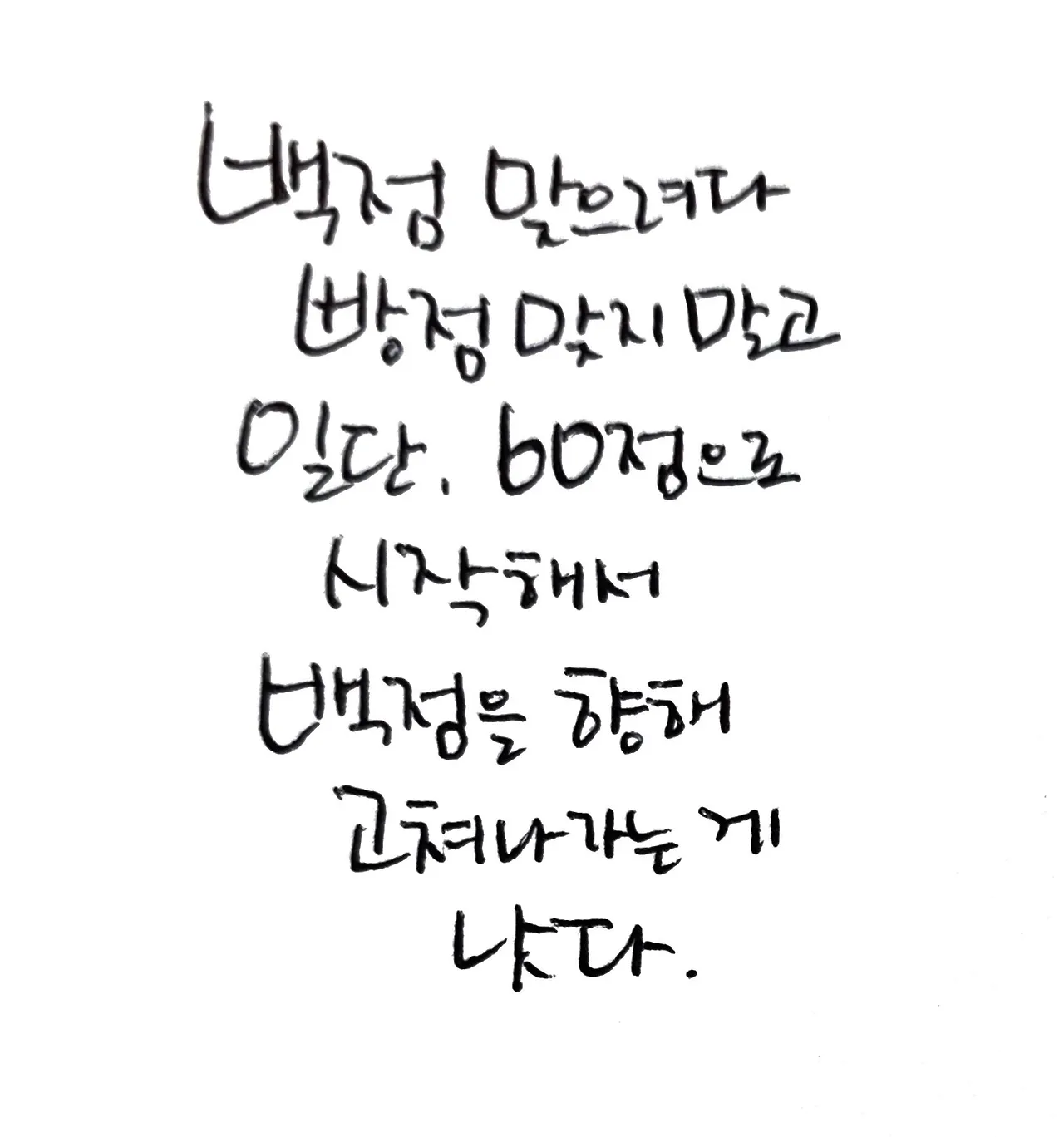위대한 작가들도 엉망인 초고를 쓰고 다듬었습니다. 시작도 하기 전에 너무 잘하려고 애쓰지 마십시오. 대충이라도 시작하는 사람이 완벽을 꿈꾸며 누워있는 사람보다 훨씬 앞서갑니다.
