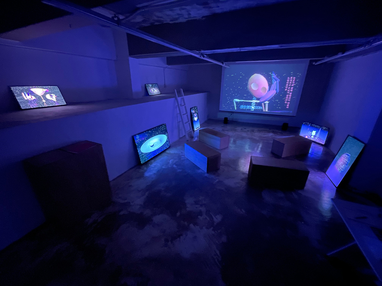 저는 화면 안에서 구현하는 공간도 일종의 무대라고 생각해요. 3D 애니메이션 안에서도 공간과 소품, 조명이 구현 가능하기 때문이죠. 이번에 팩션(Faction)에서 한 전시도 관객들이 함께 앉아 대화하듯 머물다 가면 좋겠다고 생각하고 연출했어요.