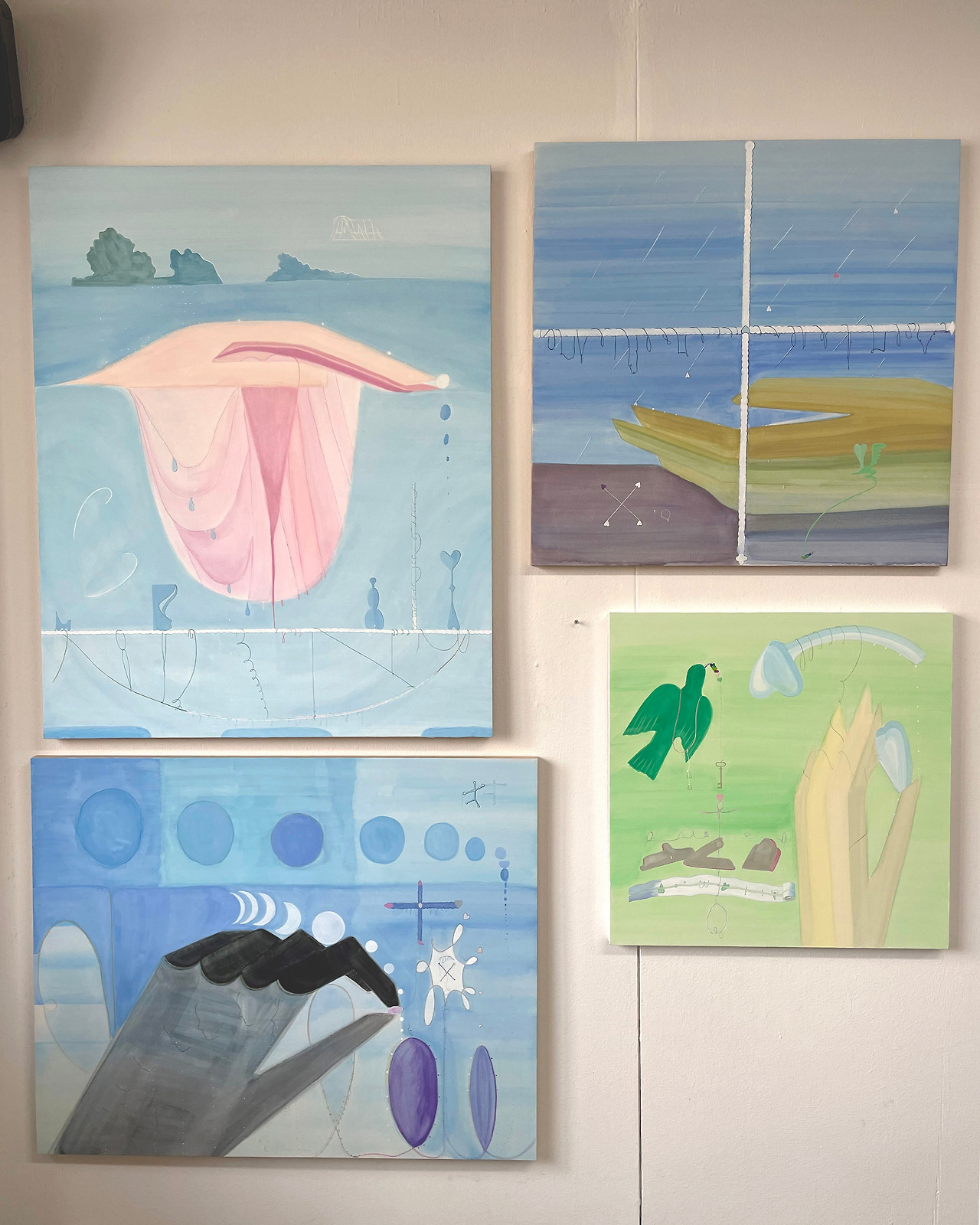 삶과 죽음이 서로 교감하는 순간, 연결에 대한 이미지를 회화에 넣고 싶었어요. 저는 '손'이 뭔가에 닿을 때 감각이 첫 번째로 전달되는 기관이라 생각했고, 손을 꼼지락 거리며 신체가 움직이기 시작한다고 생각해요. 그림에서도 손이 비나 눈을 맞거나, 뭔가를 감싸거나 만지는 포즈가 많은데, '죽음 이후 다시 태어난다면 내 손은 뭔가를 어떻게 느낄까?' 이런 상상을 하면서 손을 그렸어요
