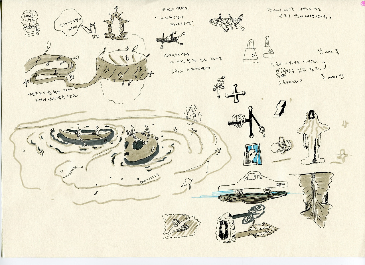 원래 그림을 통해 고민의 지점이나 단상을 탐구하다가 작년부터 형태를 모으는 방식으로 드로잉을 하고 있어요. 여름 산을 산책하는 것을 좋아하는데, 잎사귀 등 자연물에서 아이디어를 많이 얻는 편이에요. <비밀의 배> 때는 '배'가 등장하는 스토리를 어떻게 이미지로 표현할지 고민이 있었는데, 제가 몇 년 전에 원형이 되는 요소들을 스케치북에 그려두었더라고요? 제게는 드로잉이 작업의 원천인 것 같아요. 무의식적으로 그려나간 이미지가 나중에 좋은 소스가 되어서 평소에 잘 간직하는 편이에요. 계속 손을 쉬면 안 된다고 생각해요.
