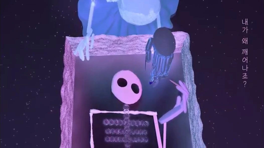 <비밀의 배>(2019)에 등장하는 여성의 비하인드 스토리에 대한 질문이 많았는데, 이 여성이 못다 한 자신의 이야기를 하면 좋겠다는 생각으로 <미지의 해골> 영상을 만들었어요. 한때 누군가의 애인, 아내, 뮤즈였던 한 여성이 억울하게 죽은 후 핑크 해골이 되어 다시 살아나는 애니메이션이에요. 이 작업을 시작할 때 죽은 사람이 다시 태어나는 이야기를 해보고 싶다는 생각을 시작으로, 세계관을 만들어 나갔어요. 저는 상상력을 중요시 여겨요. <미지의 해골>에서도 '눈알 와인'을 마시면 망각의 기억이 되살아난다거나, 공포가 사라진다거나 하는 식으로 이미지마다 부여된 의미가 있죠. 이러한 상상을 하는 데에 책이나 시의 은유를 많이 참고해요.