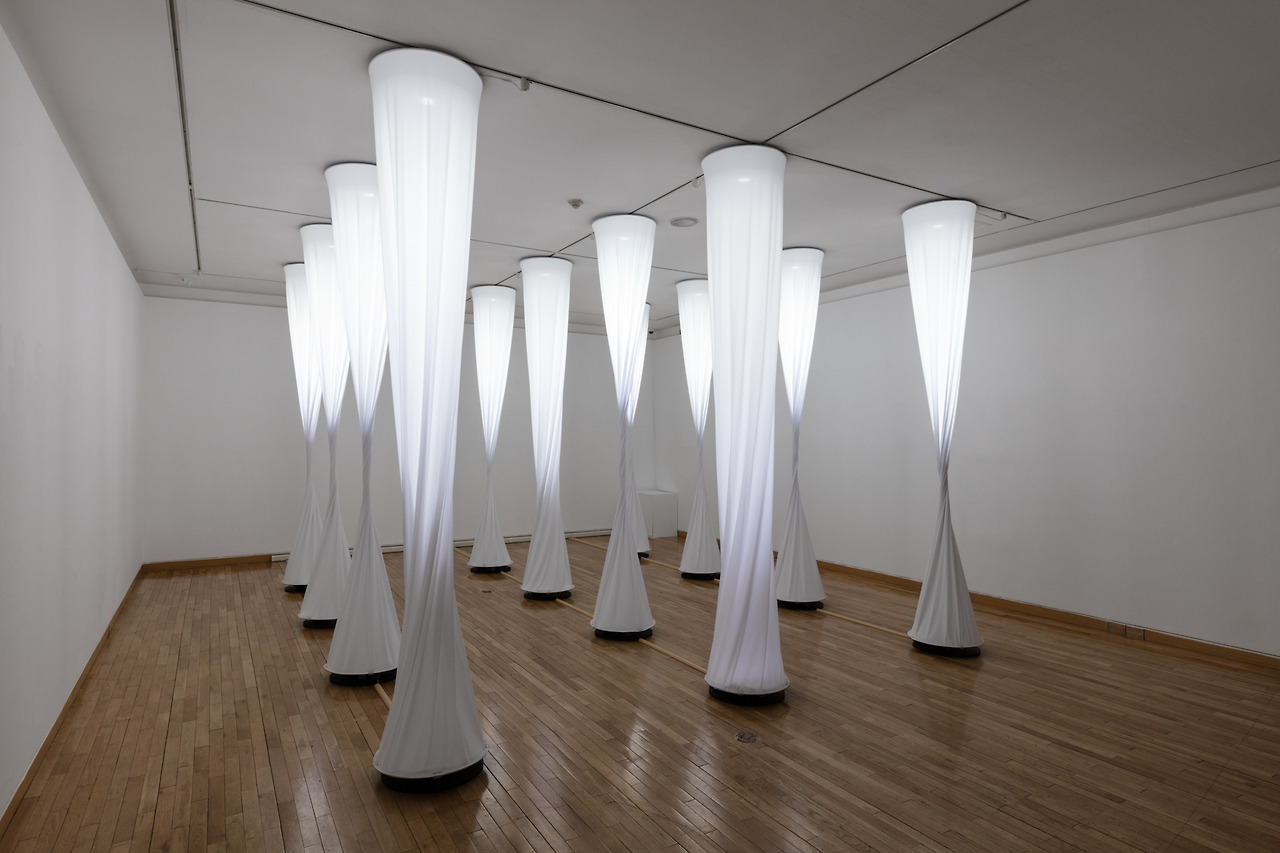 이번에는 특히 기둥 작업을 신경 썼어요. 전시 공간을 보니, 상대적으로 안쪽은 층고가 높고 율동감이 있는데 반해 가장 처음 발 딛게 되는 공간은 눌려 있고 답답한 느낌을 받았어요. 그래서 반대되는 텐션을 주고 싶다는 고민을 하면서 공간을 다뤄보았어요.《타원궤도》(2016)에서 선보인 <고정된 축> 작업을 발전시켜 작업을 하였죠. 수많은 기둥이 건축물을 받치고 있는 파르테논 신전을 거니는 장면을 상상했어요. 이 작업은 관찰자의 시점에 따라 다르게 느껴져요. 기둥이 회전한다고 느끼는 시점을 기둥 내부의 공간을 중심으로 바꾸어보면 마치 전시장의 천장과 바닥이 서로 역방향으로 돌고 있다고 느낄 수 있겠죠. 우리가 지구의 자전 공전을 느끼지 못하고 살아가는 것처럼 한눈에 느껴지지 않더라도 공간만이 가진 흐름과 움직임이 있다고 생각을 해요. 이런 것을 어떻게 시각적으로 풀어볼까 하다가 이 작업이 나오게 되었어요. '기둥 사이를 천천히 거닐다 보면 구겨지는 공간과 공존하고 있다는 생각을 할 수 있지 않을까?'라는 생각에서 만든 작업이에요.