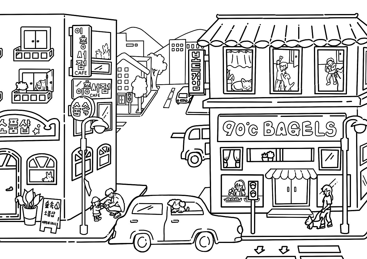 글(에세이)과 그림(컬러링) 페이지를 따로 두어서, 구매자가 그림 페이지에 색칠한 후에 필요하다면 뜯어서 엽서로 사용한다는 실용적인 아이디어가 번쩍 일었습니다. 그 때문에 책의 형태지만 뜯어 사용할 수 있는 엽서 북으로 제작하면 좋겠다고 생각했습니다. 하지만 엽서 북의 제작 비용이 일반 책의 배는 비싸서 비용 문제에 고민이 되었습니다.