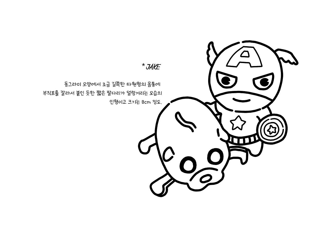*JAKE 동그라미 모양에서 조금 길쭉한 타원형의 몸통에 부직포를 잘라서 붙인 듯한 짧은 팔다리가 덜렁거리는 모습의 인형이고 크기는 8cm 정도.