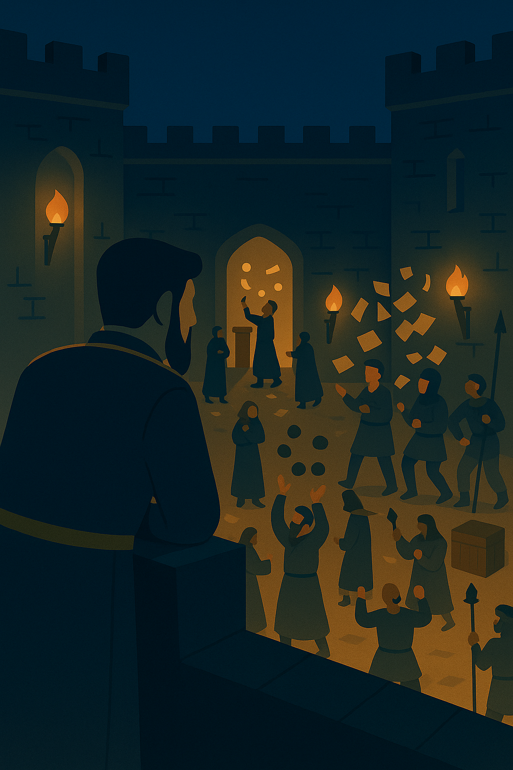 전임 성주가 노래 금지령으로 ‘폭군’이라 불렸던 걸 기억하고 있었기 때문이다. 처음엔 악사와 시인들이 조용히 공연했다. 하지만 이튿날, 대장장이는 종을 두드리며 음악이라 했고, 세금 담당관은 장부를 찢어 ‘추상’이라 불렀다. 성문 수비병들은 근무 중 춤을 추다 문을 열어둔 채 잠들었다. 성주는 스스로를 위로했다.