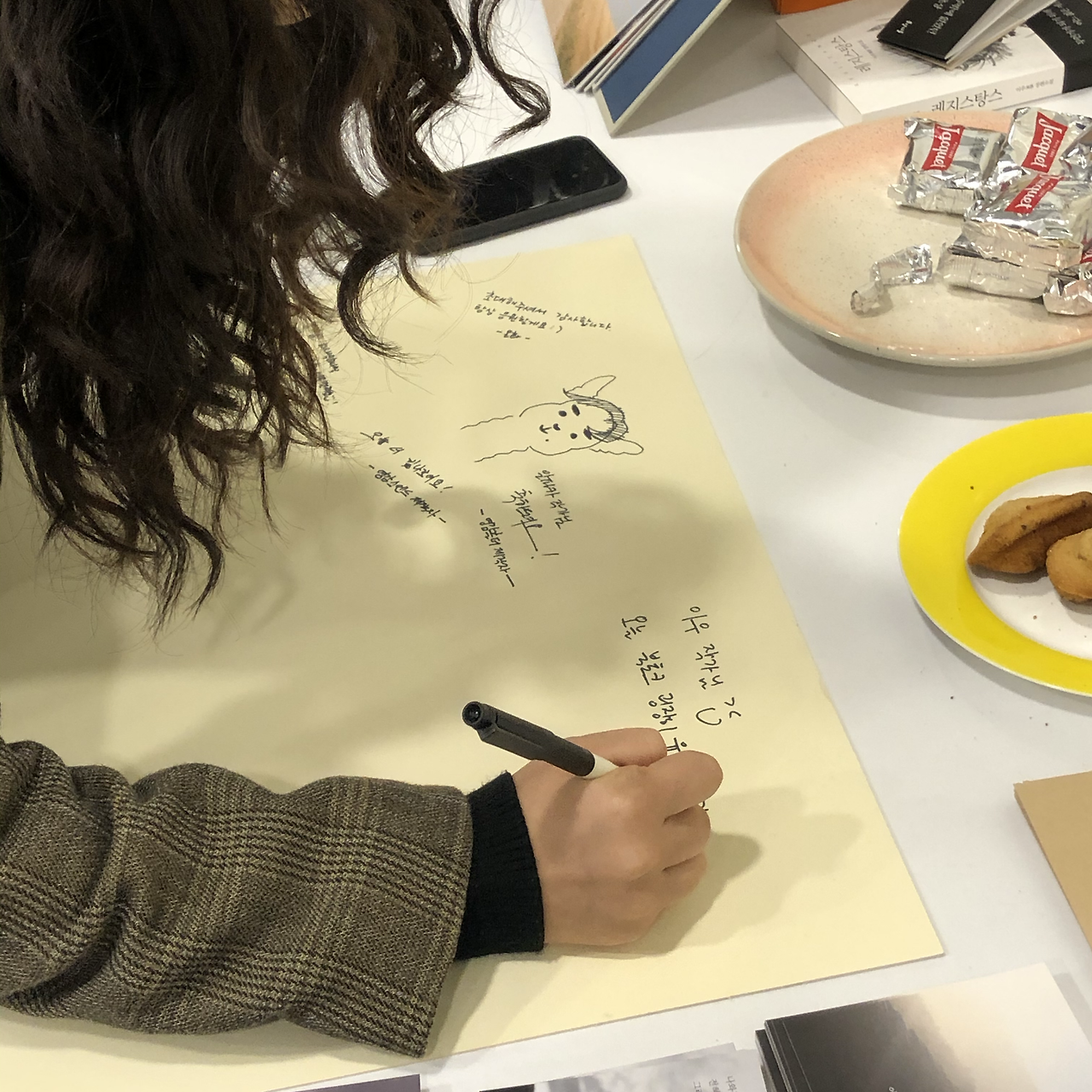 "이번 북토크를 결심하게 된 건 이 장벽을 허물어보고 싶어서였어요. 문득 그런 생각이 들더라고요. 제 꿈은 훌륭한 문학가가 되는 건데, 과연 장벽을 앞에 두고 과연 그런 사람이 될 수 있을까. 문학이라는 게 본래 사람에 대한 탐구이자 이해를 하려는 시도이잖아요. 그런데 사람들과 대화도 관계도 갖지 않고, 온전한 공감과 이해도 하지 않고 오직 활자를 통해서만 그것들을 피상적으로 받아들인 채, 그것들을 문학으로 승화시킬 수 있을까요. 저는 그럴 수 없다는 결론에 도달했어요. 장벽 뒤에서 장벽만 쌓는 사람은 결코 훌륭한 문학가가 될 수 없을 테니까요. 시대와 호흡하는 문학가가 되어보려 해요. 아무래도 오늘, 여러분과의 만남이 세상을 향한 저의 첫 걸음마가 될 것 같아요."