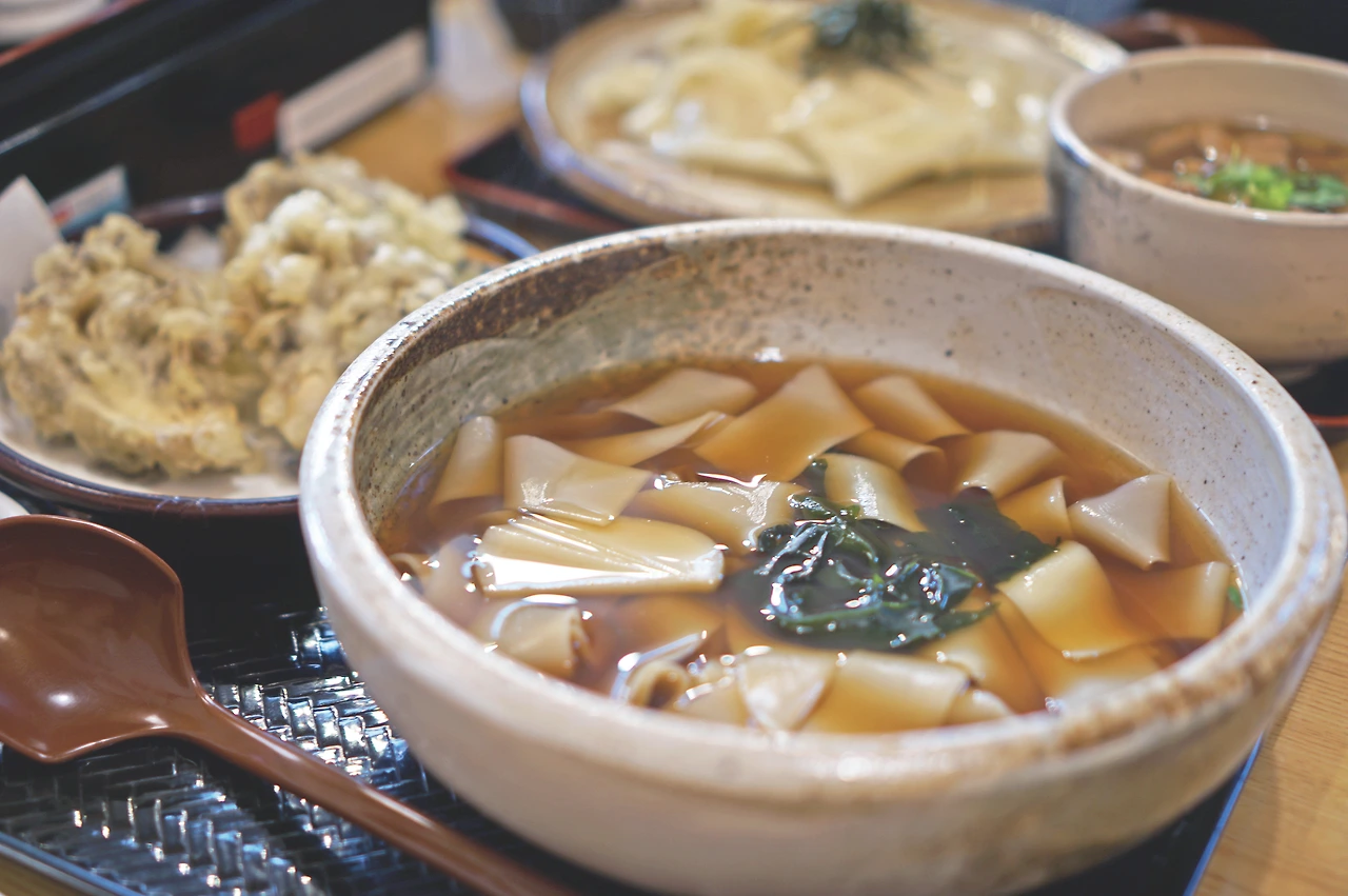 조슈上州 지역의 밀가루를 사용한 폭이 넓고 얇은 히모카와 우동ひもかわうどん을 제공하는 우동 전문점. 지역 특산물인 잎새 버섯 튀김도 곁들이면 금상첨화다. 유바타케에서 도보 2분 거리이므로 구경을 마치고, 우동 한 그릇으로 허기를 채워보자.