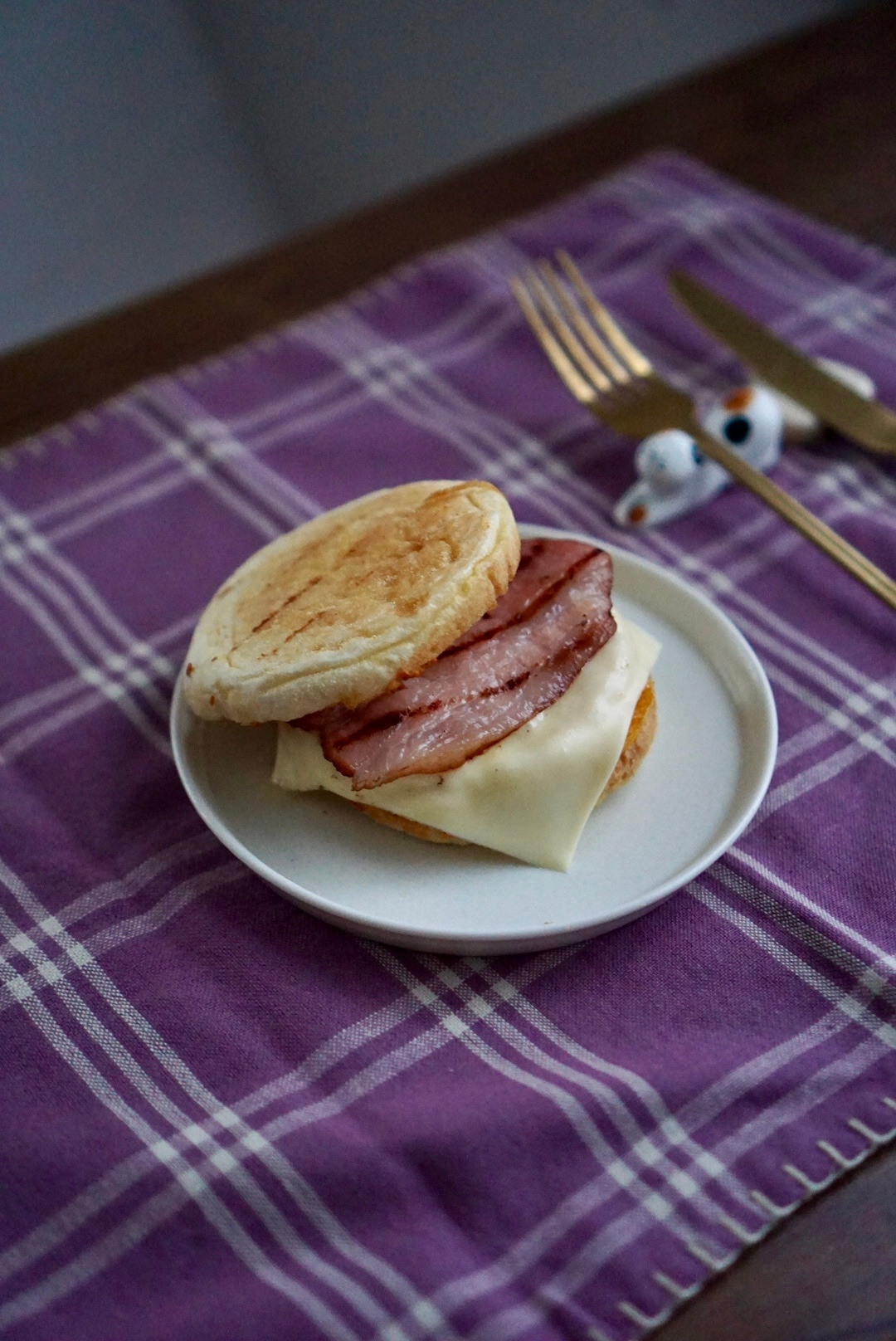 재료: 잉글리시 머핀1, 달걀1, 두꺼운 베이컨 1줄(얇은 베이컨이라면 2줄), 슬라이스 치즈 1장, 마요네즈 1T, 버터 2T