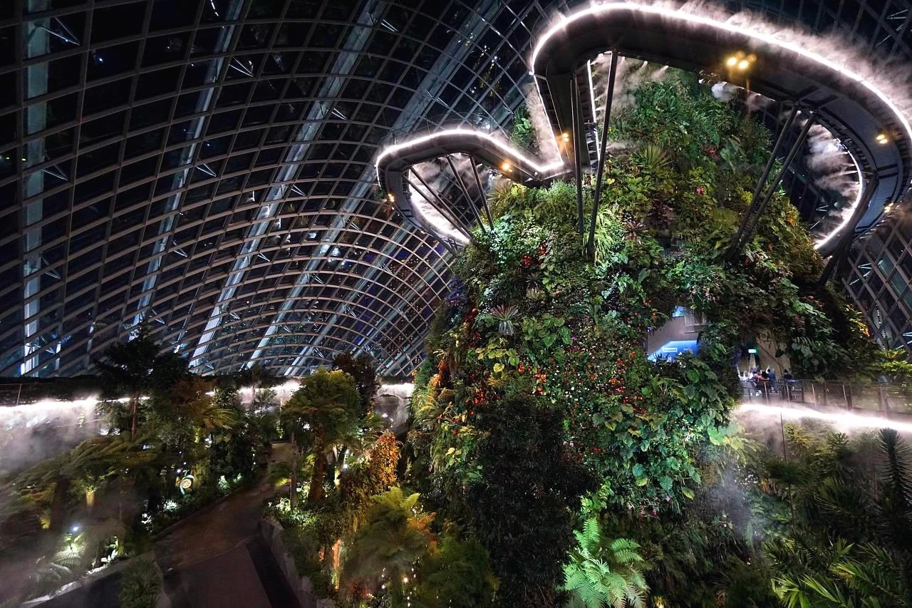 가든스 더 베이에서 가장 인상 깊었던 시설은 클라우드 포레스트(Cloud Forest)였다. 들어서는 순간 35m 높이의 인공 산에서 쏟아지는 물줄기 소리가 청각을 사로잡고, 고개를 다 젖혀야 그 끝이 보일 정도로 장엄한 풍경이 시각을 압도한다. 맨 꼭대기에 있는 로스트 월드(Lost World)에는 해발 2000m 고지대 식물이 살고, 공중에 설치된 클라우드 워크(Cloud Walk)를 걸을 때는 구름 대신 미스트가 뿜어져 나온다. 이 산은 사실 인위적인 건축물에 불과하지만, 꽃과 풀로 뒤덮여 있어서인지 자연을 트래킹 하는 듯 상쾌하다. 물론, 엘리베이터와 에스컬레이터를 타고 말이다.