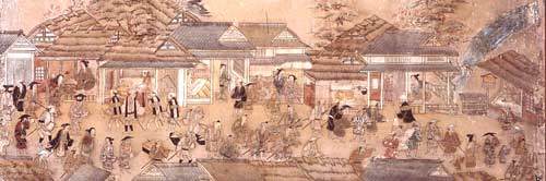 가가와현의 주식인 우동의 역사는 9세기로 거슬러 올라간다. 헤이안 시대(794~1185)에 당나라로 불교 유학을 다녀온 승려 ‘고보 대사’가 밀을 제분해 국수 만드는 법을 배워와 전파했다는 설이 가장 유력하다. 예로부터 가가와현이 따뜻하고 강수량이 적어 쌀보다는 밀 재배가 쉬운 탓도 있었다. 가장 오래된 자료는 겐로쿠 시대(1688~1704)에 그려진 병풍 ‘금비라제례도(金毘羅祭礼図)’인데, 고토히라궁에서 제사를 올리는 풍경에 우동 집이 세 군데나 들어 있다. 적어도 300년 전부터 우동을 즐겨 먹었다는 이야기다.