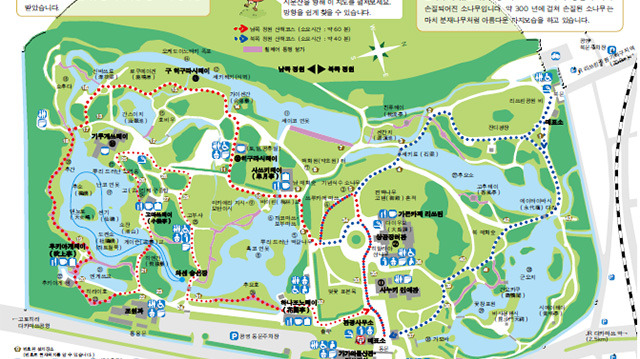 리쓰린공원에서 추천하는 정식 산책법은 이렇다. 공원을 산책하는 코스는 크게 ‘북쪽 정원 산책 코스’와 ‘남쪽 정원 산책 코스’ 두 가지가 있다. 둘 중 하나를 선택, 입구에서 나누어 주는 팸플릿 속 지도를 시우산을 향해 펼쳐 들고 걷는다. 현대적인 분위기의 북쪽 정원에는 잔디광장과 꽃창포원, 오리 사냥터가 대표적인 볼거리다. 일본의 고전적인 정취가 가득한 남쪽 정원에서는 난코 연못에서 뱃놀이하거나 곳곳에 세워진 다실에서 전통차를 즐기기 좋다. 정해진 두 코스를 전부 걷는 데는 두 시간 가까이 걸린다.