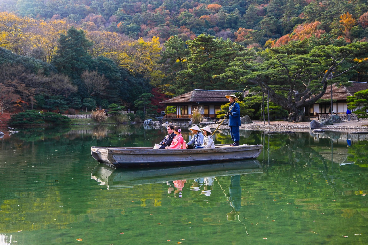 게으름의 유혹이 파고들 때, 자리를 훌훌 털고 일어나 본다. 아직 산책의 클라이맥스가 남아 있기 때문이다. 둥근 엔게쓰교와 짧은 돌다리를 건너, 후지산을 본떠 만들었다는 히라이호 봉우리에 올라가면 난코 연못이 한눈에 들어오는 그림 같은 풍경이 펼쳐진다. 리쓰린공원을 대표하는 전망이다. 이 풍경에 봄에는 벚꽃, 여름에는 신록, 가을에는 단풍, 그리고 겨울에는 눈꽃이 색을 덧입힌다. 주말에는 관광객이 탄 배가 오가며 생동감을 더하기도 한다.