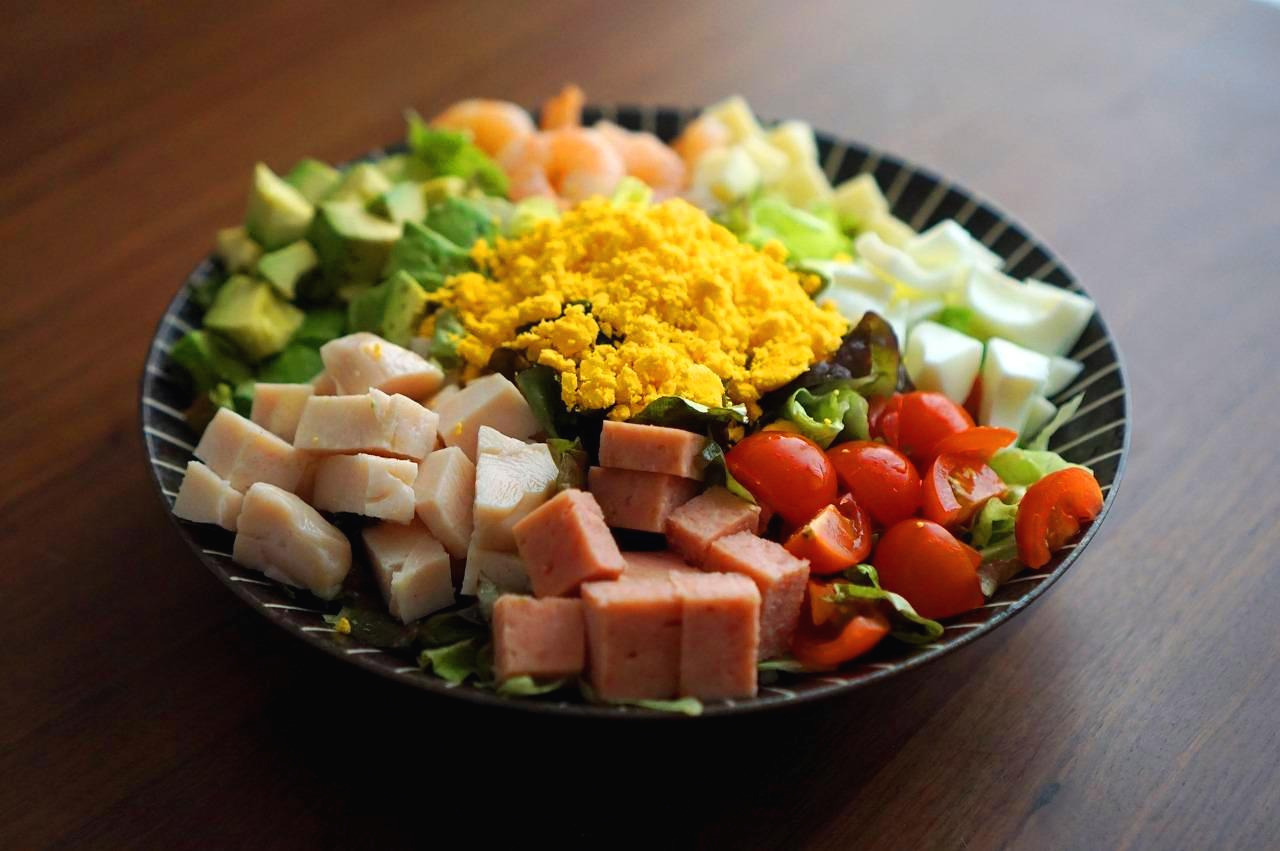 저는 모든 재료를 비슷한 크기로 잘라 포크로 꼬치처럼 꿰어먹는 것을 좋아합니다. 콥샐러드처럼요. 참고로 콥샐러드는 1937년, 미국 할리우드의 브라운 더비 레스토랑(Brown Derby Restaurant)에서 근무하던 로버트 하워드 콥(Robert Howard Cobb) 셰프가 개발한 샐러드로, 냉장고에 남은 자투리 재료를 잘게 썰어 먹던 데서 유래했다고 합니다.