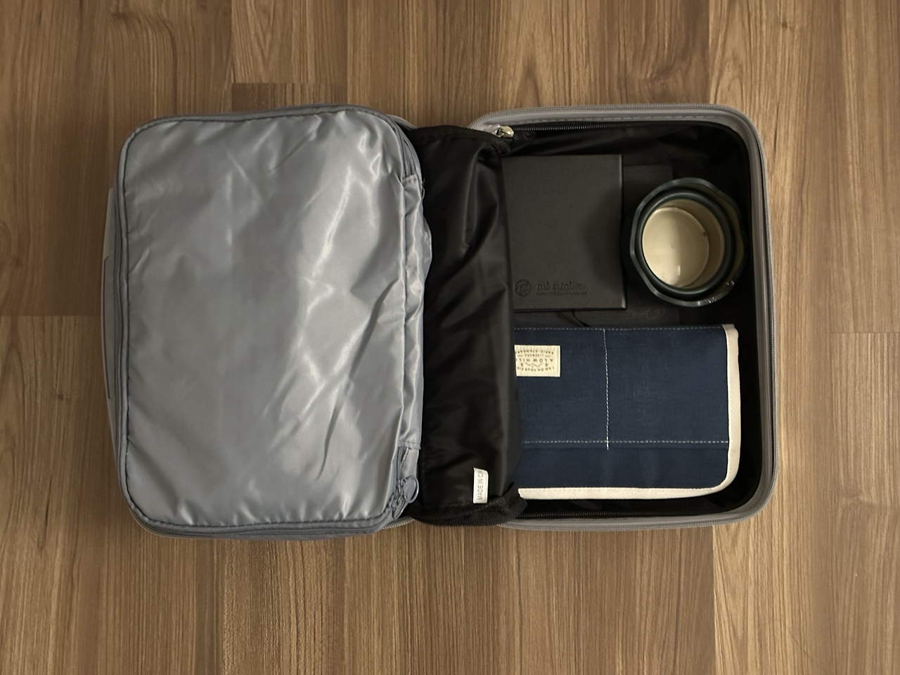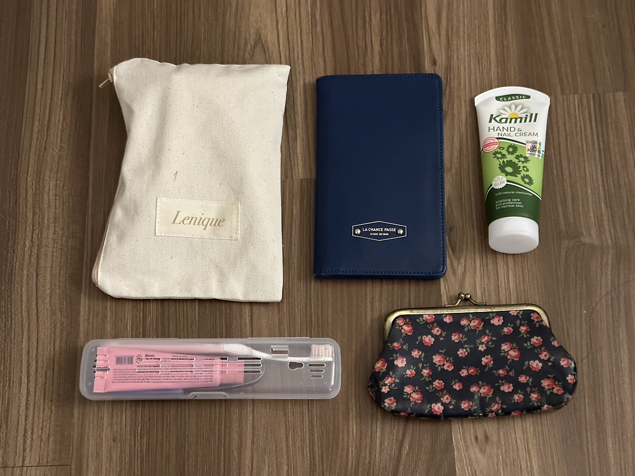 공항, 기내에서 쓸 짐들. 여권과 핸드크림, 치약과 칫솔, 그리고 잡화 용품들이다. 공항에서 배낭을 앞으로 하거나 캐리어 열고 뒤적거리는 일이 얼마나 귀찮은지 잘 알기 때문에 가볍게 꺼내려고 보조 가방에 담았다.
