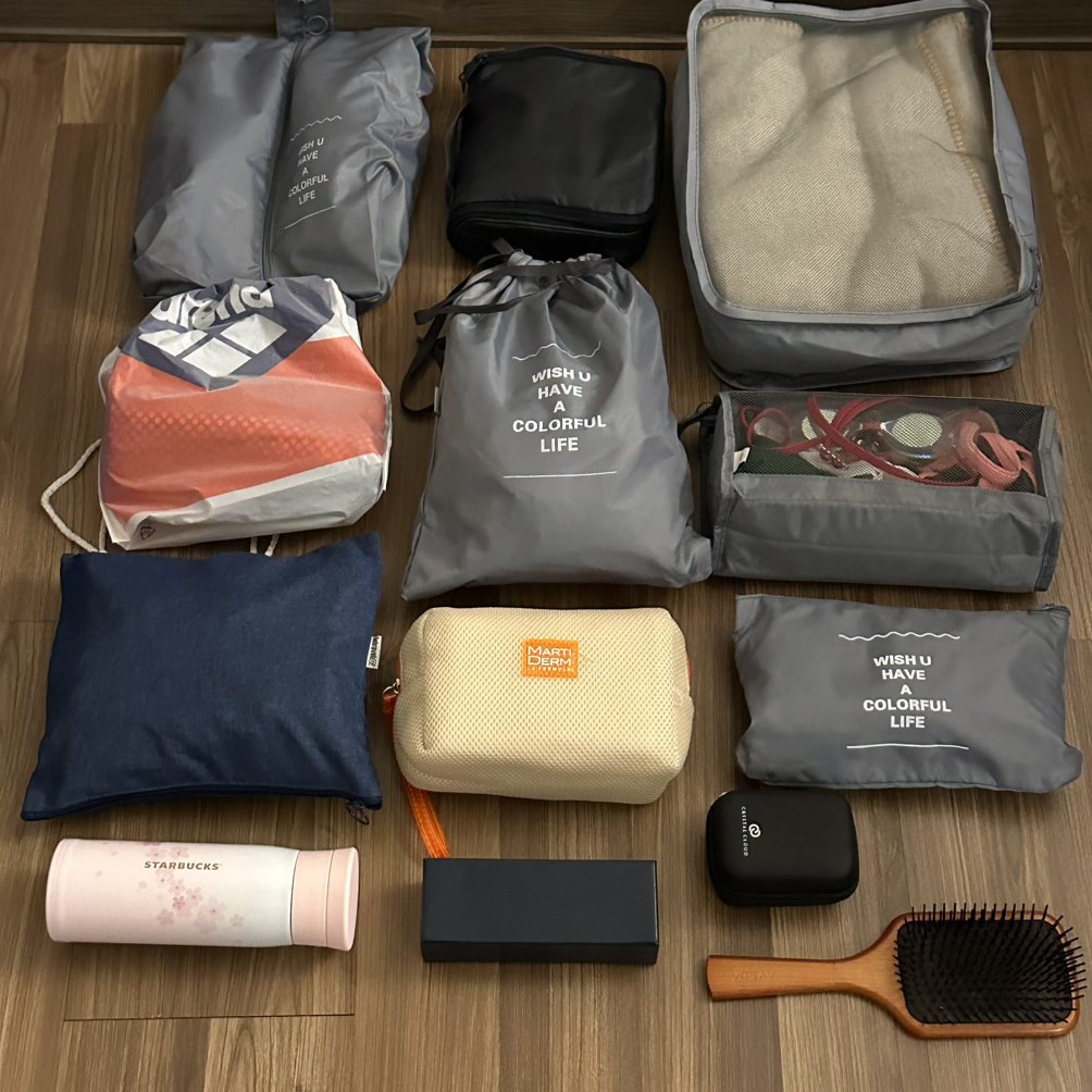 맨 위부터 차례로 실내화, 세안 도구, 샤워용품, 핫팩 꾸러미, 수영복, 잡화류, 생리대, 상비약, 보온병, 선글라스, 여행용 콘센트, 빗.