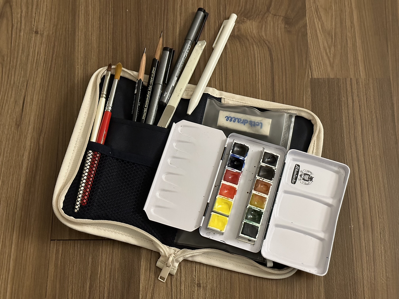 구독자분이 팬사인회 때 선물해주신 펜 파우치. 이 안에 정말 많은 것들을 담을 수 있다. 고체 물감과 붓, 그리고 기타 미술도구를 수납했다.