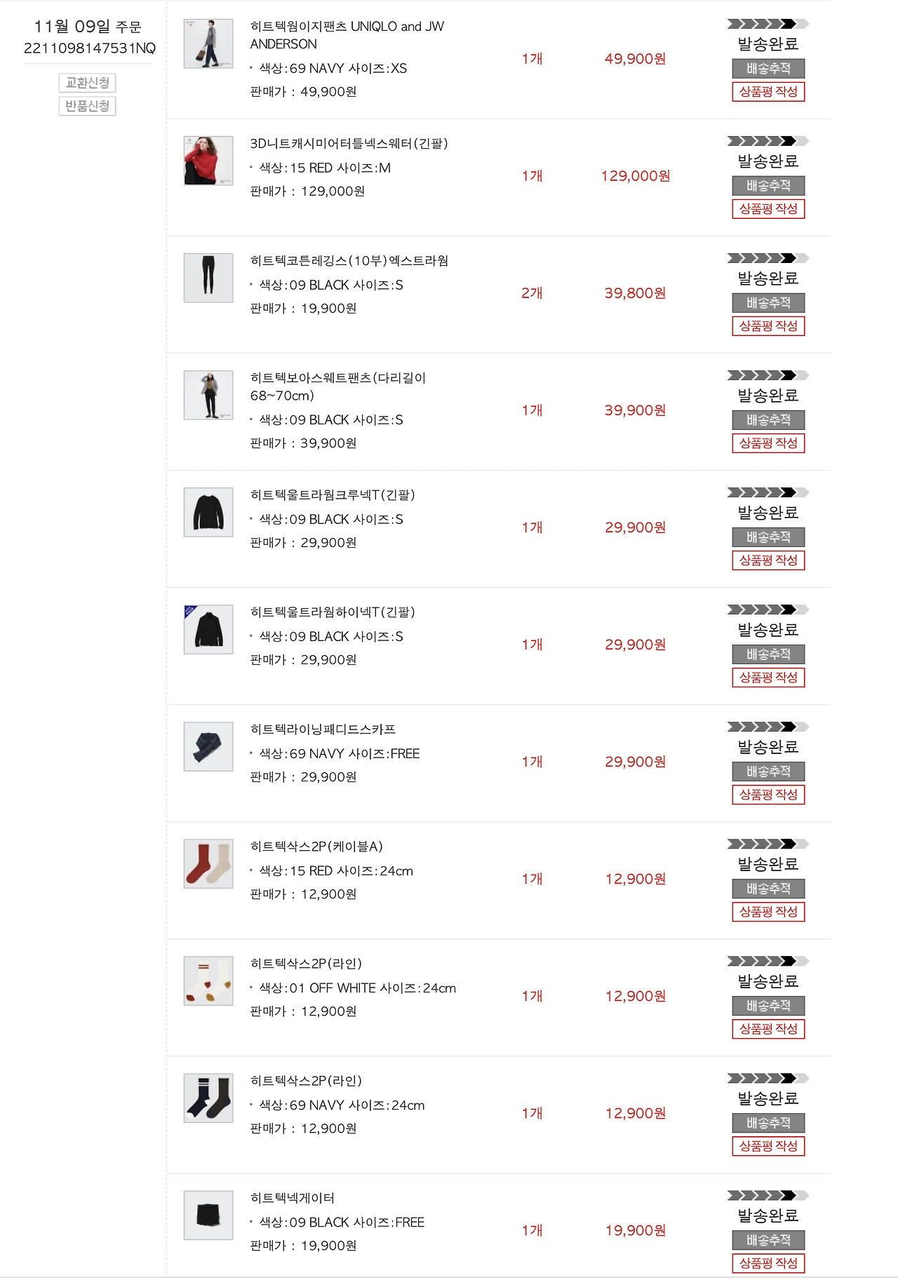 그 외에는 유니클로의 도움을 많이 빌렸다. 아래는 히트텍에 미쳐버린 사람의 구매 목록... 추위를 많이 타지만 입으로 춥다는 말을 계속 꺼내는 걸 멋없다고 생각하는 편이기에 단단히 챙겼다. 주문 날짜가 11월 9일이라는 점이 새삼 부끄럽다. 나의 설레발의 역사가 이리도 길었다니. 하지만 설레는 걸 어떡하나.
