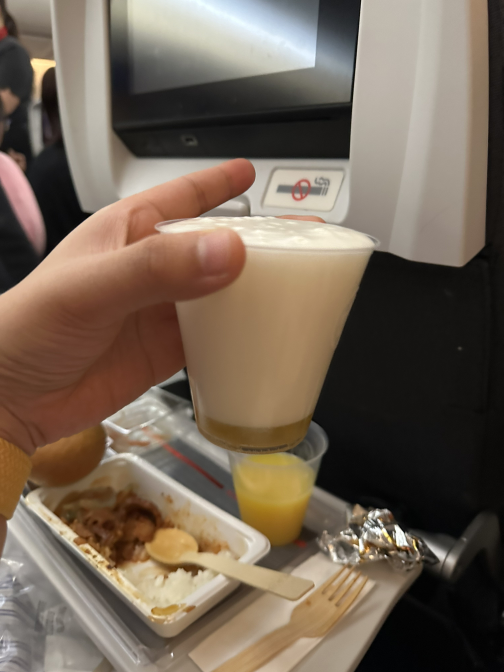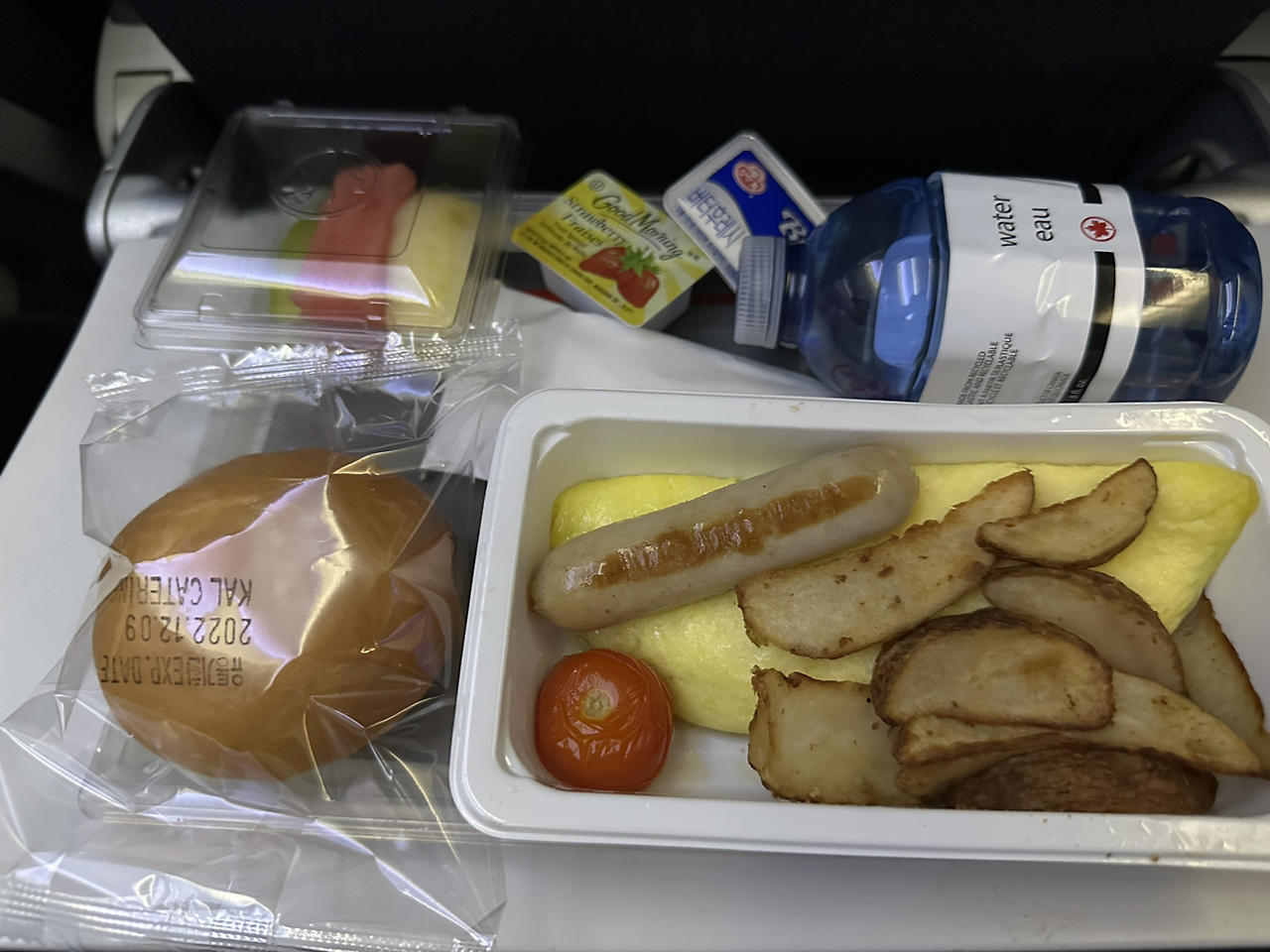아침으로 나온 기내식. 손도 못 댔다. 과일만 먹었음. 혀와 위장이 원하지 않는 타이밍과 맛이었다. 이걸 먹지 않아서 온종일 기운이 없었지...(봉크)