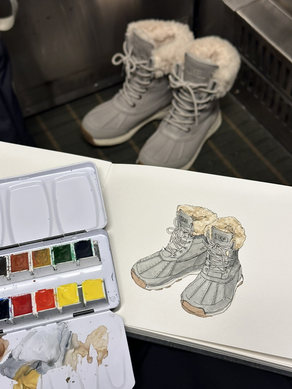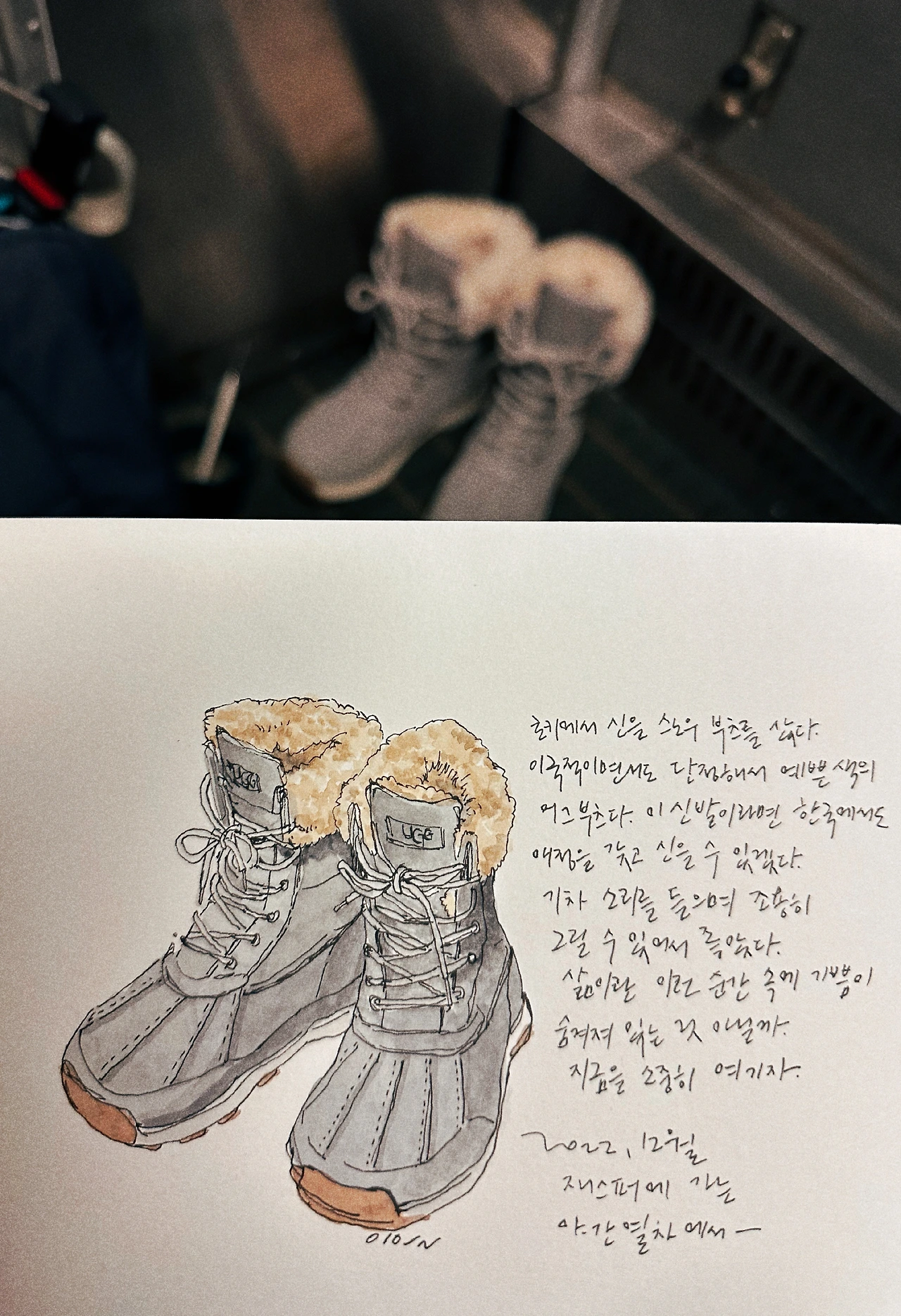아직 기차가 멀리 가지 않아 창밖 풍경은 평범한 도시 풍경이었다. 의자에 앉아 가깝게 보이는 나의 새 신발을 그렸다. 생각한 색감이 물감으로 잘 구현되어 좋았다. 조금 따뜻한 웜 그레이 컬러, 황톳빛을 띄고 있는 퍼의 색감까지.