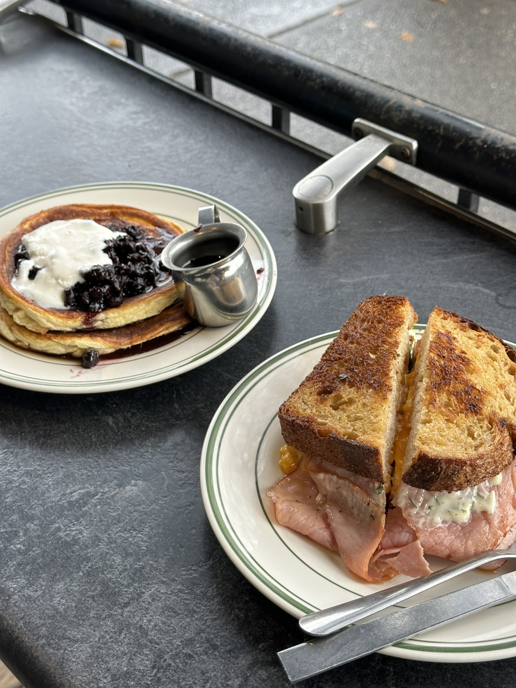 주문하고 나온 음식. 겉으로는 꽤 평범하게 보이는데 하나하나 조화가 좋다. 최고의 단짠 밸런스랄까. 핫케이크는 수플레 팬케이크처럼 폭신한 식감이 돋보였고, 샌드위치는 재료들이 잘 어울려서 좋았다. 평소에 큰 군말 없이 먹는 우리인데, 이때는 둘 다 극찬을 했다. 이거라면 기차 타기 전에 기다리는 사람들에게 모두 추천할 수 있겠어!