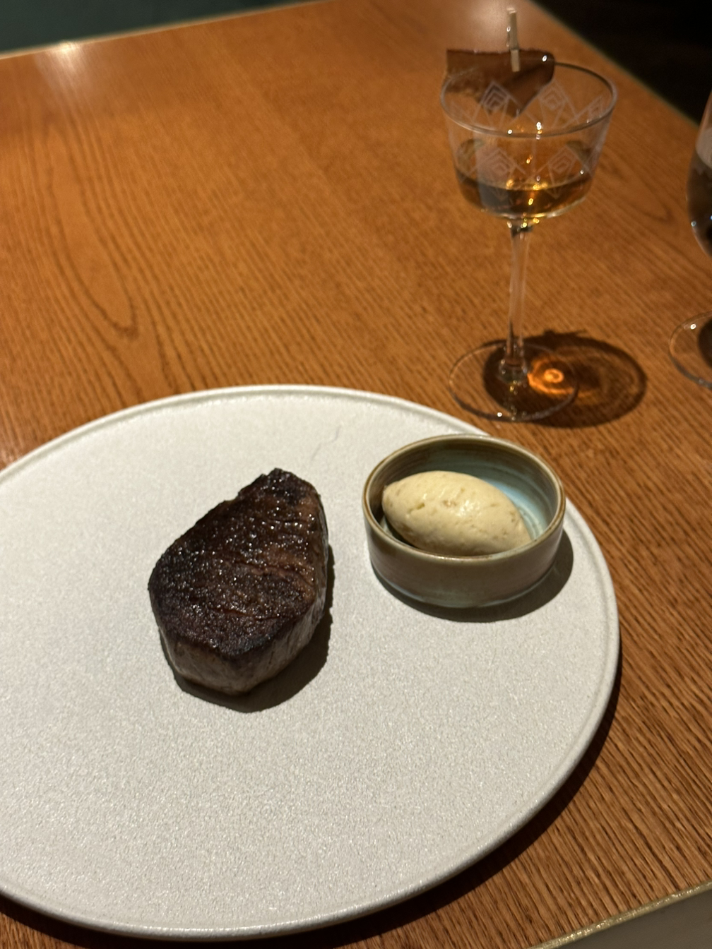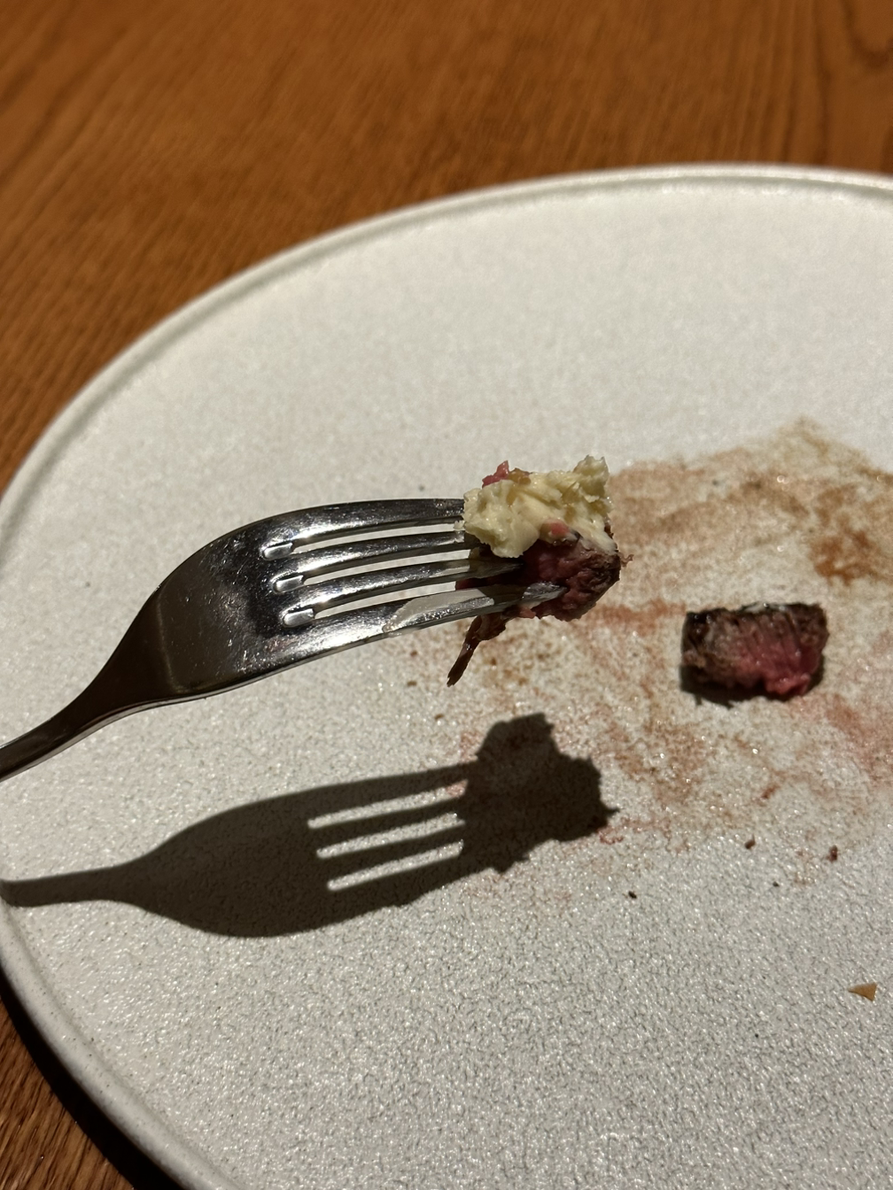 가격은 96달러인데 사이즈는 작은 와규. 양이 딱 맞아서 오히려 좋았다. 옆에 있는 흰 덩어리는 버터인데 캐러멜 라이즈 한 양파와 함께 섞은 것 같았다. 일반 버터보다 더 풍미 있게 녹아드는 맛. 스테이크와 함께 먹으니 최고였다. 이렇게 연식당 메뉴 개발 들어갑니다...